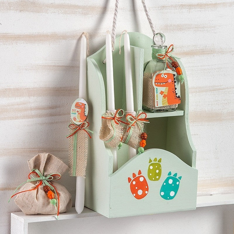 Ξύλινη κρεμαστή συσκευασία βαμμένη σε απόχρωση πράσινη-λαδί που χρησιμεύει ως ράφι λαδικών. Στο μπροστινό μέρος έχει ζωγραφιστά πατουσάκια δεινοσαύρου πορτοκαλί-πράσινα και τιρκουάζ.Ο κωδικός περιλαμβάνει τα 3 κεράκια, το σαπούνι μέσα σε πουγκάκι και το μπουκάλι του λαδιού, όλα στολισμένα σε φυσικές-πορτοκαλί-πράσινες αποχρώσεις με κορδέλες.