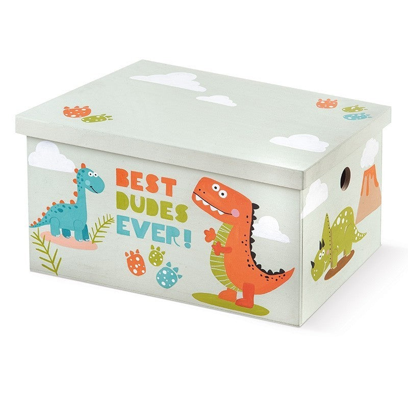 Χειροποίητο Σετ βαπτιστικών Ξύλινη natural κασέλα με καπάκι, συσκευασία βάπτισης ζωγραφισμένη στο χέρι με θέμα τους δεινόσαυρους πάνω σε φόντο πράσινο-λαδί και σε αποχρώσεις πορτοκαλί-πράσινες-τιρκουάζ.Το καπάκι διακοσμείται επίσης με πατουσάκια δεινοσαύρων σε αποχρώσεις πορτοκαλί-τιρκουάζ και πράσινες και με ζωγραφιστά λευκά συννεφάκια.