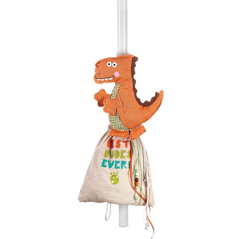 Λαμπάδα βάπτισης,διακοσμημένη με λινή τσάντα πάνω στην οποία είναι ζωγραφισμένη η φράση BEST DUDES EVER. Τη λαμπάδα διακοσμεί επίσης ένας εντυπωσιακός πάνινος δεινόσαυρος ενώ από την τσάντα κρέμονται κορδέλες πορτοκαλί και πράσινες με πολύχρωμες χάντρες.