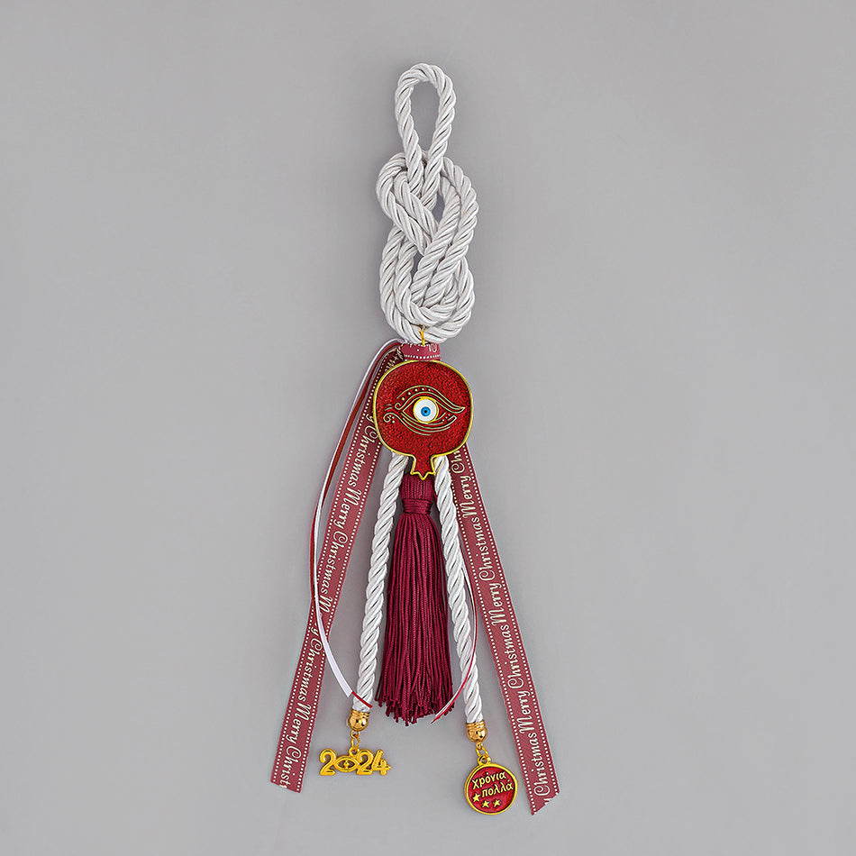 Χριστουγεννιάτικο χειροποίητο γούρι 2026 Κρεμαστό με κορδόνι & μεταλλικό Διακοσμητικό Ρόδι με Μάτι Κόκκινο 5Χ6εκ, φούντα και μεταλλική χρονολογία 2026.