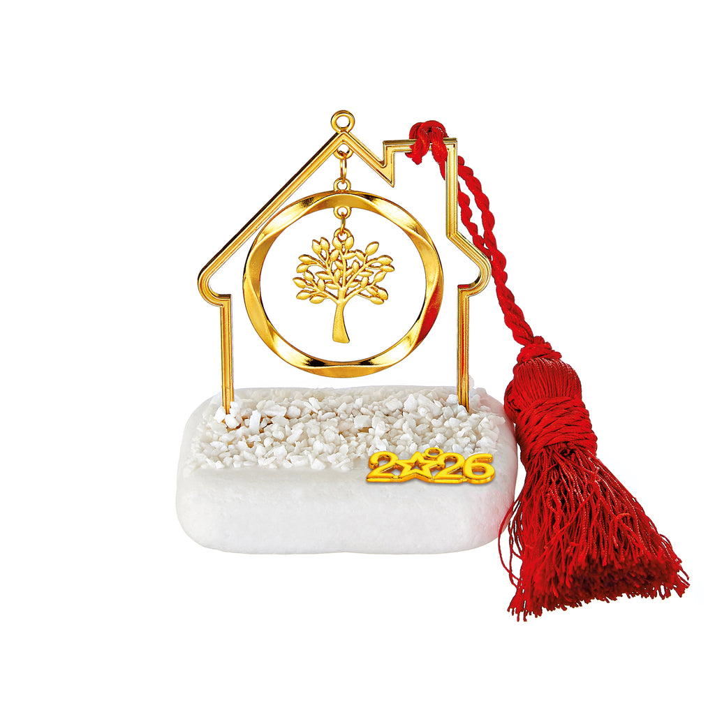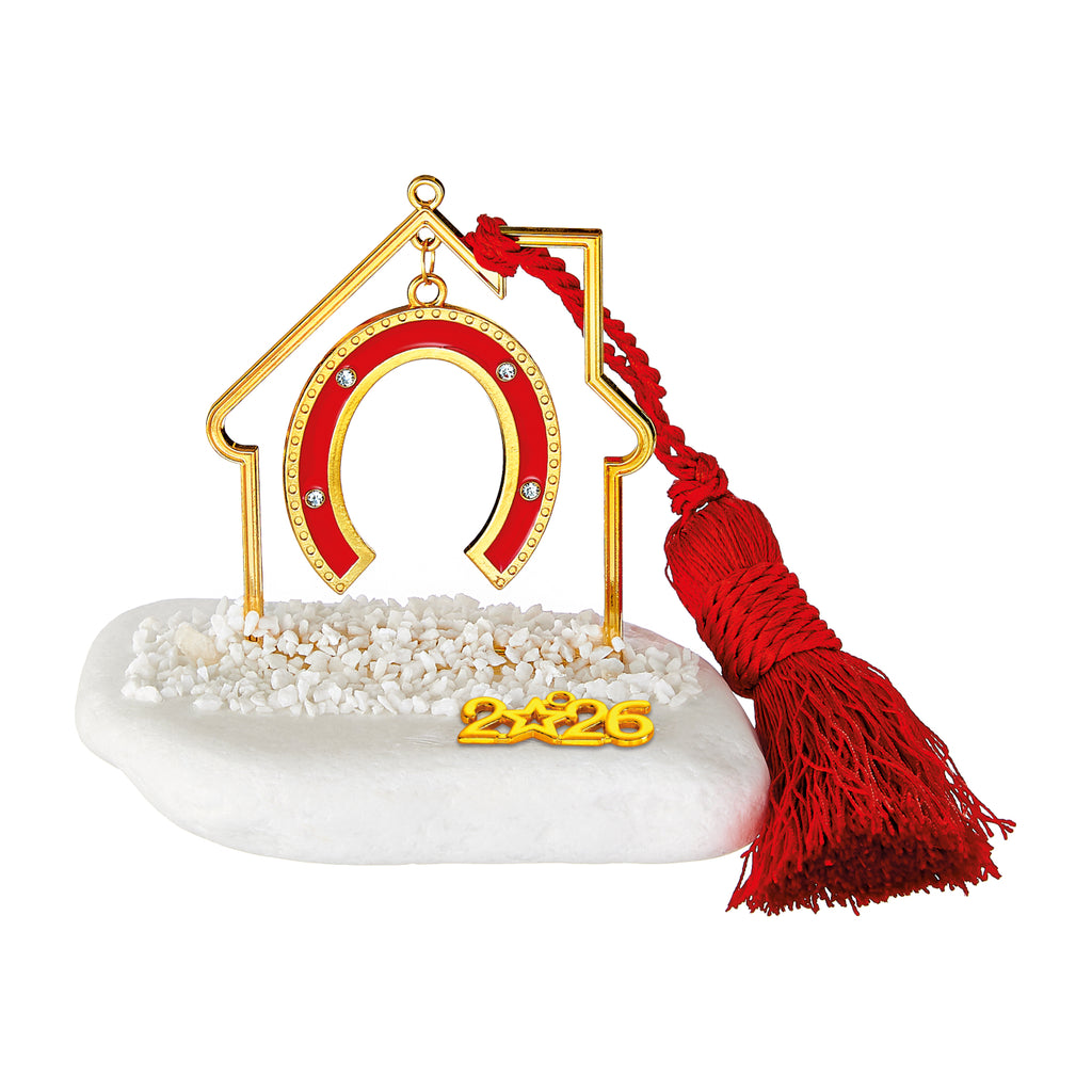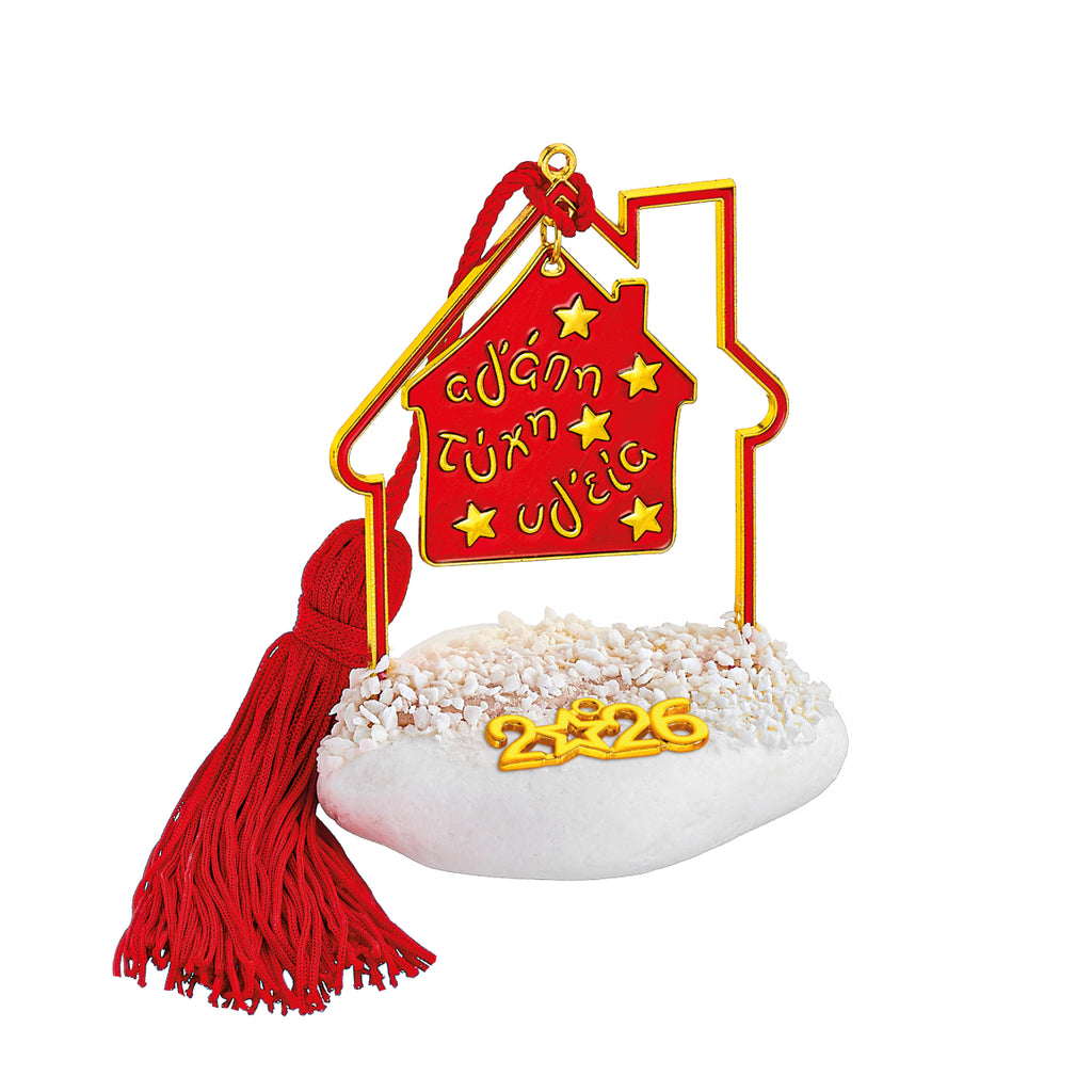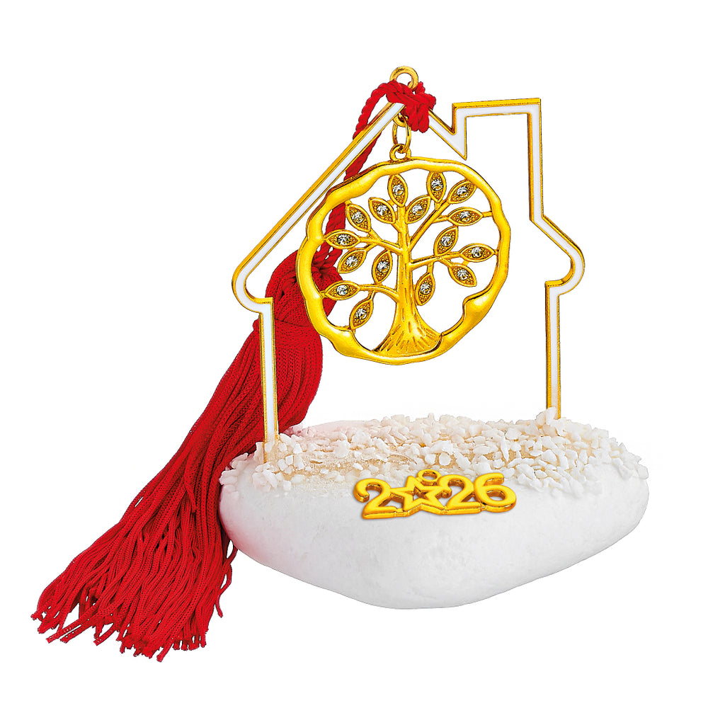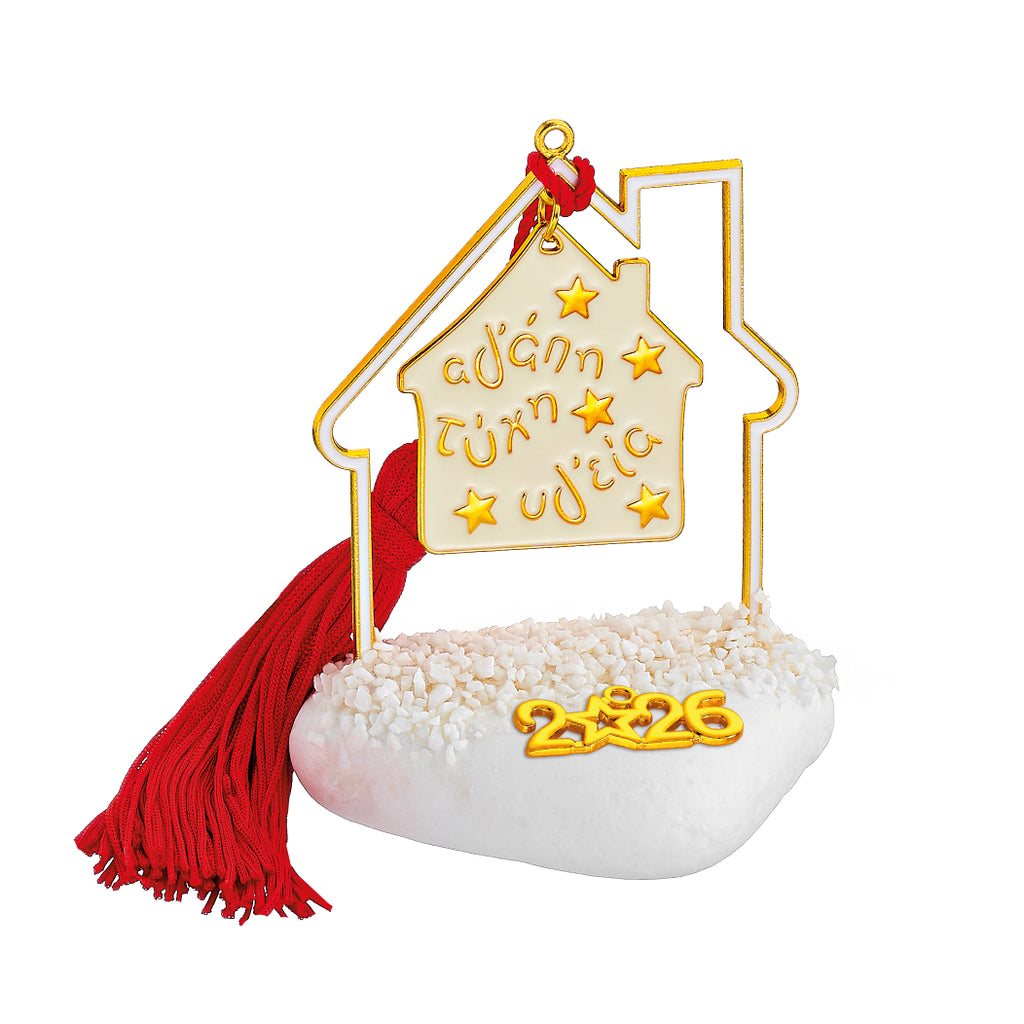 Ένα ιδιαίτερο χειροποίητο γούρι για το 2026, με φυσική πέτρα, σπιτάκι με σμάλτο και γιορτινά μεταλλικά στοιχεία. Ιδανικό για να χαρίσετε τύχη και αγάπη σε φίλους, οικογένεια ή πελάτες.