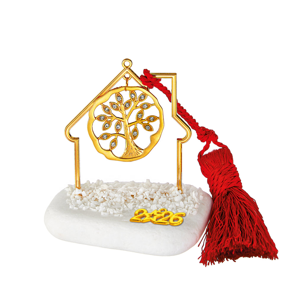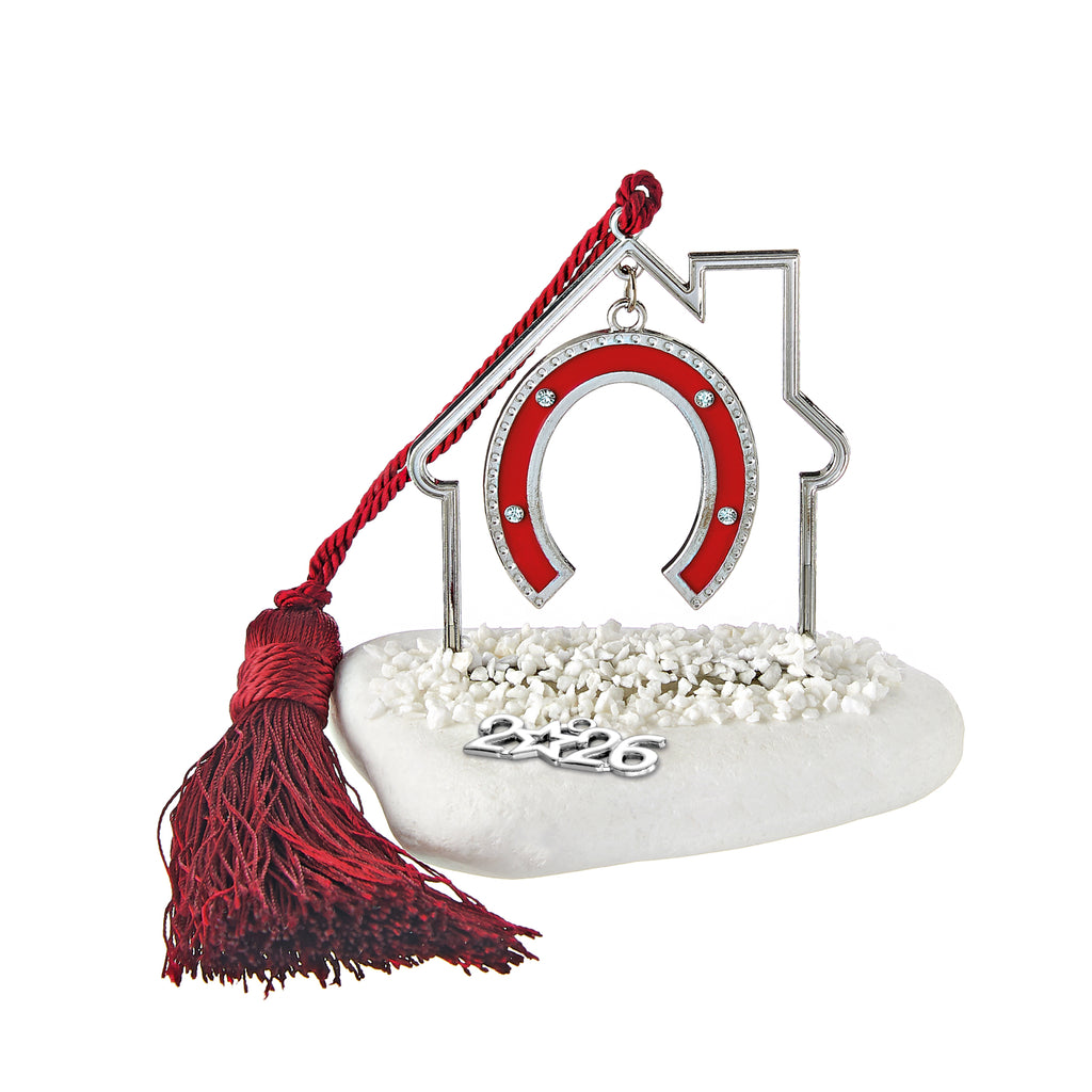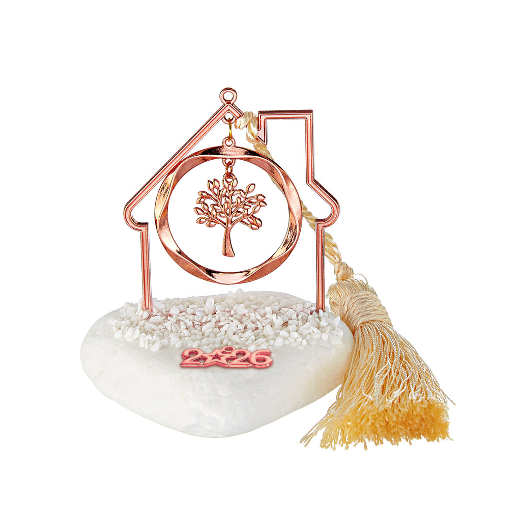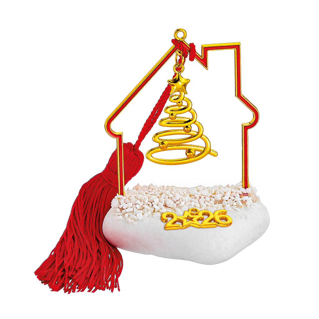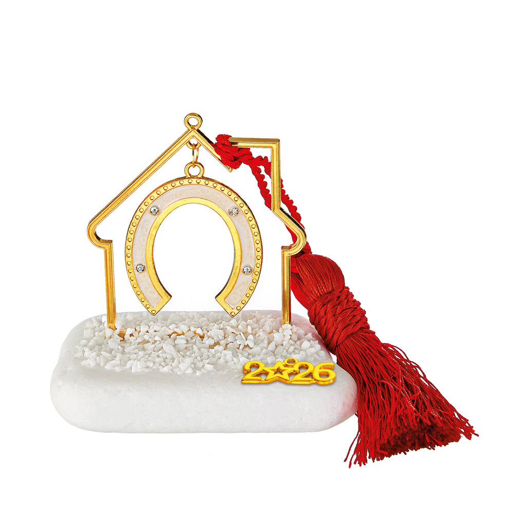 Ένα ιδιαίτερο χειροποίητο γούρι για το 2026, με φυσική πέτρα, σπιτάκι με σμάλτο και γιορτινά μεταλλικά στοιχεία. Ιδανικό για να χαρίσετε τύχη και αγάπη σε φίλους, οικογένεια ή πελάτες.