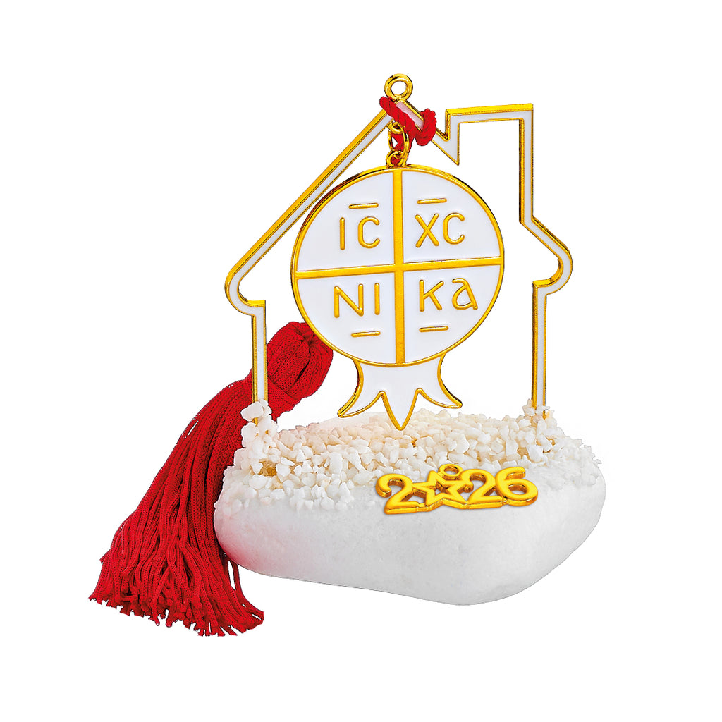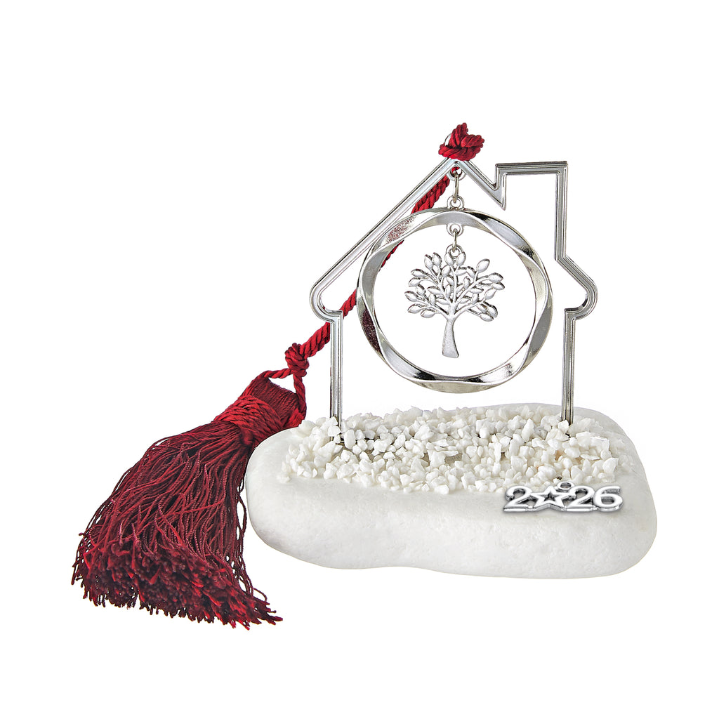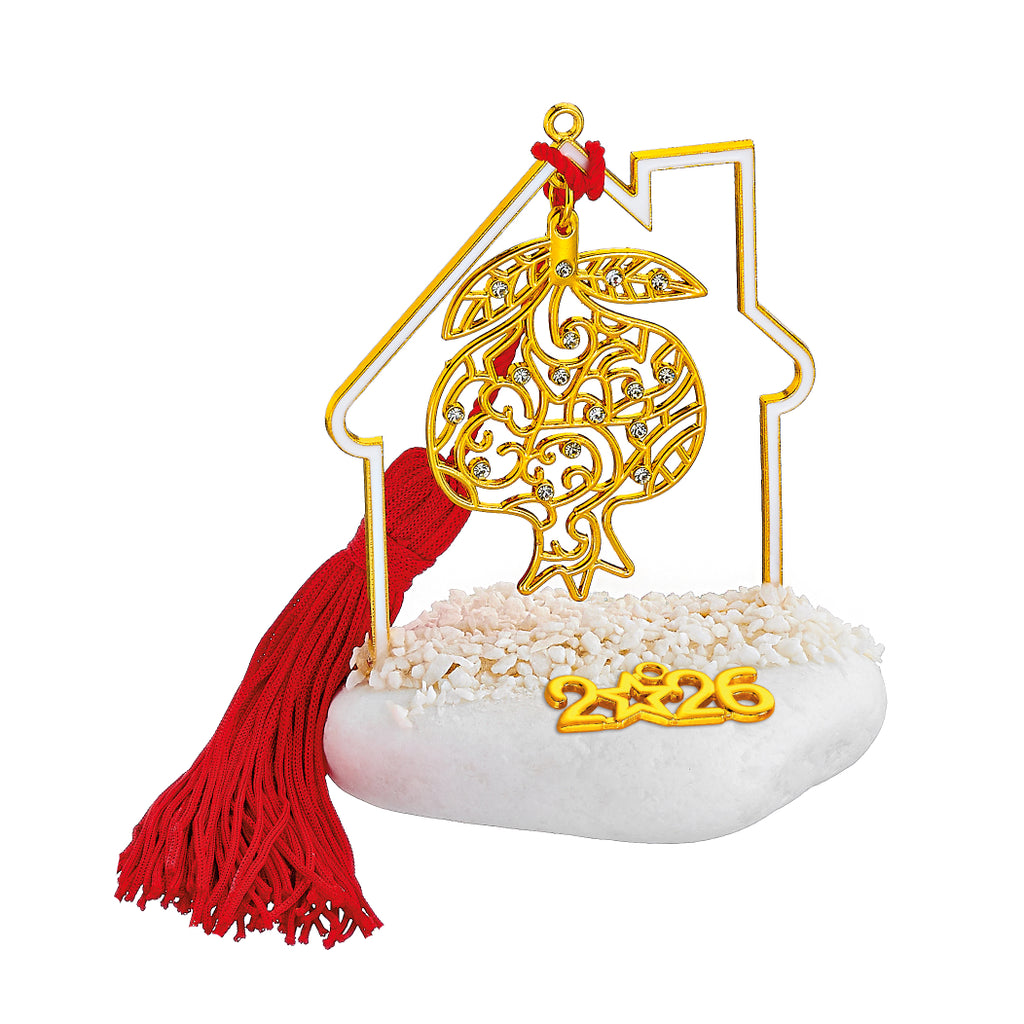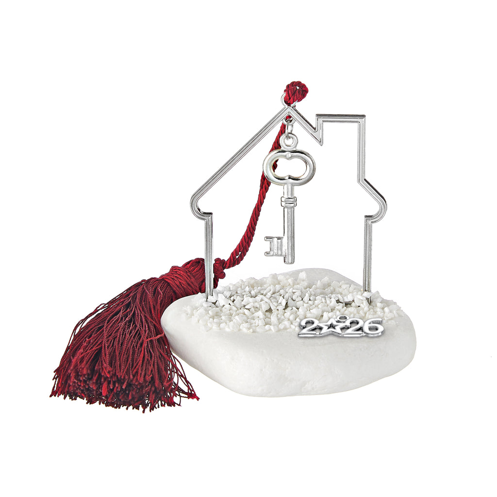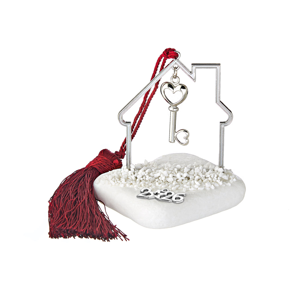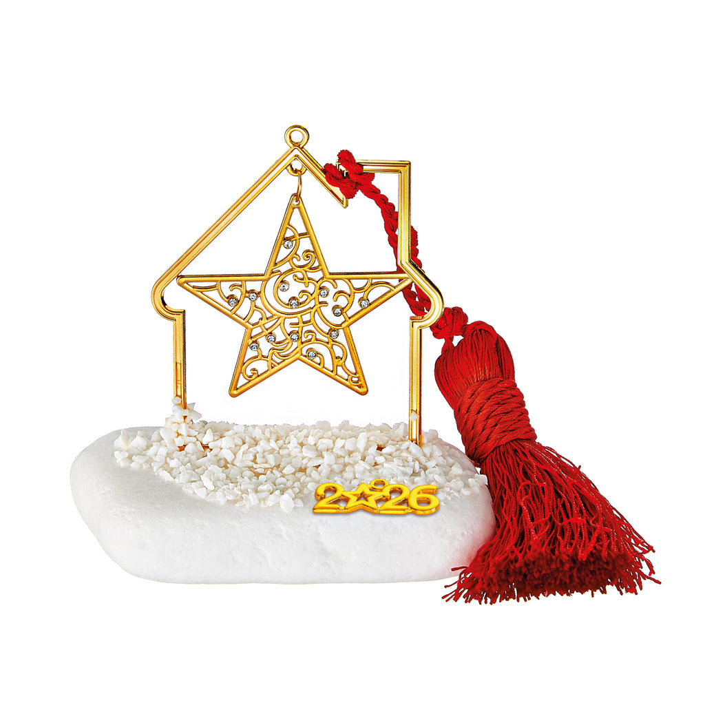 Ένα ιδιαίτερο χειροποίητο γούρι για το 2026, με φυσική πέτρα, σπιτάκι με σμάλτο και γιορτινά μεταλλικά στοιχεία. Ιδανικό για να χαρίσετε τύχη και αγάπη σε φίλους, οικογένεια ή πελάτες.
