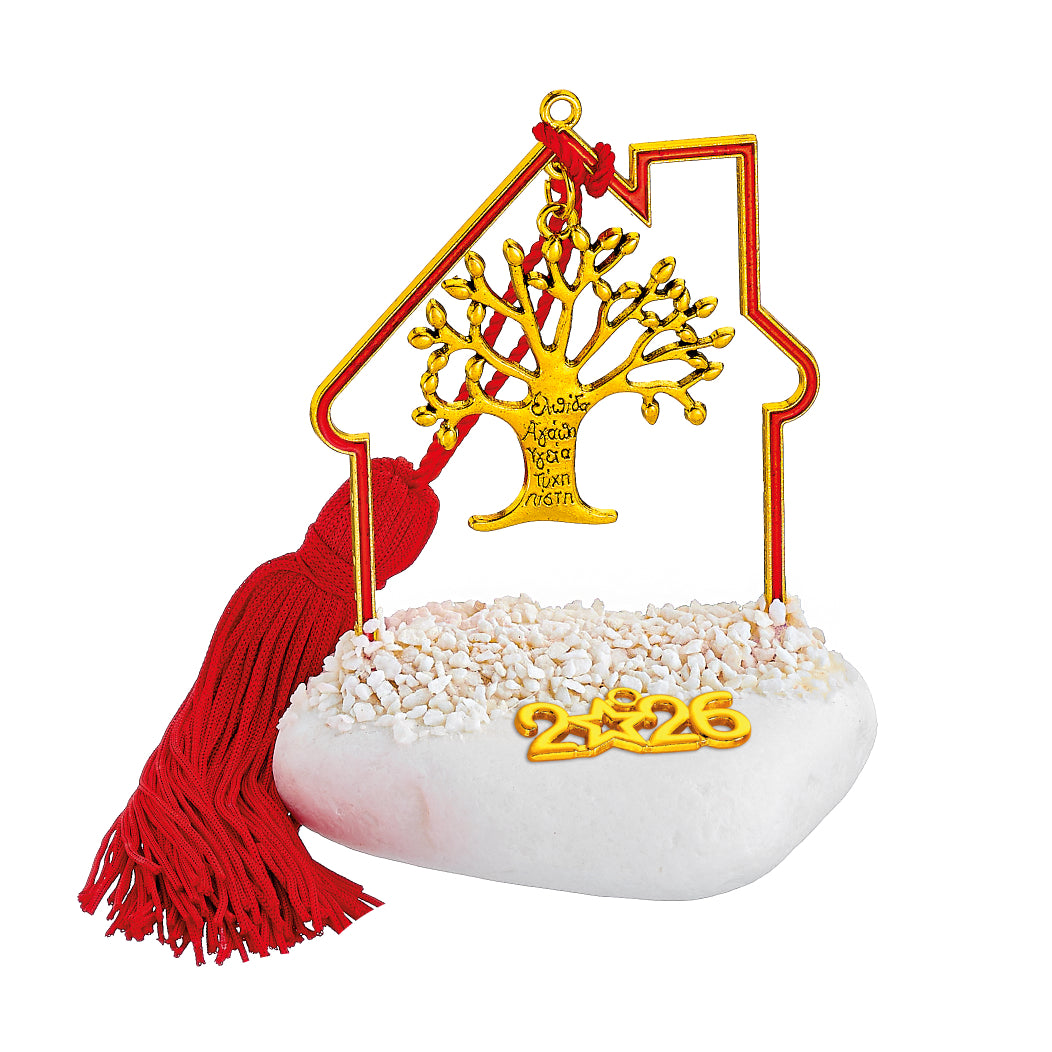 Γούρι 2026 Βότσαλο Περίγραμμα Σπιτάκι Κόκκινο & Δέντρο με Ευχές Χρυσό Υ10εκ.