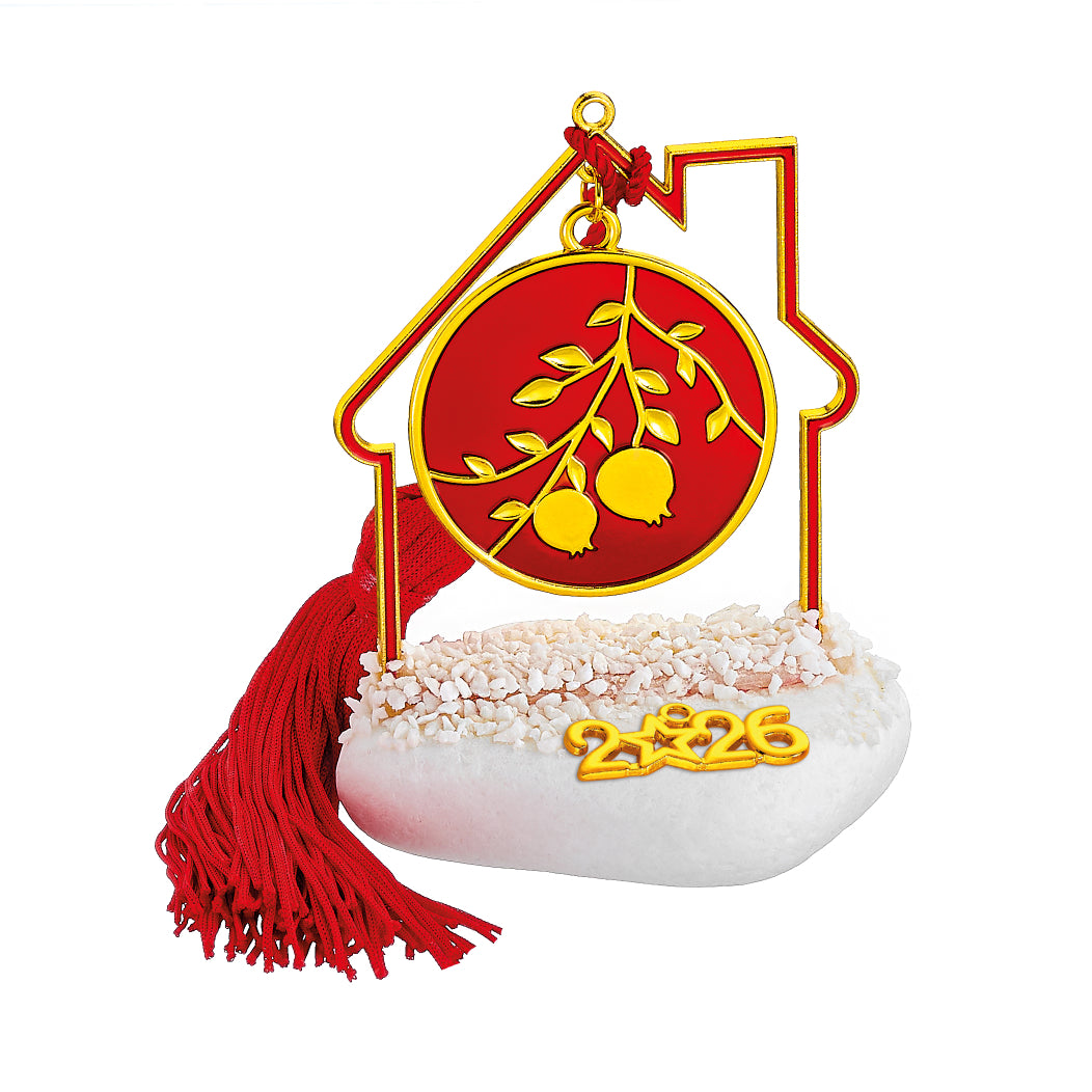 Χειροποίητο Επιτραπέζιο Γούρι 2026  Βότσαλο με μεταλλικό Περίγραμμα Σπιτάκι Κόκκινο σμάλτο, φούντα &  Μοτίφ Κλαδιά με Ρόδια Στρογγυλό Σμάλτο κόκκινο περίπου Υ10εκ.