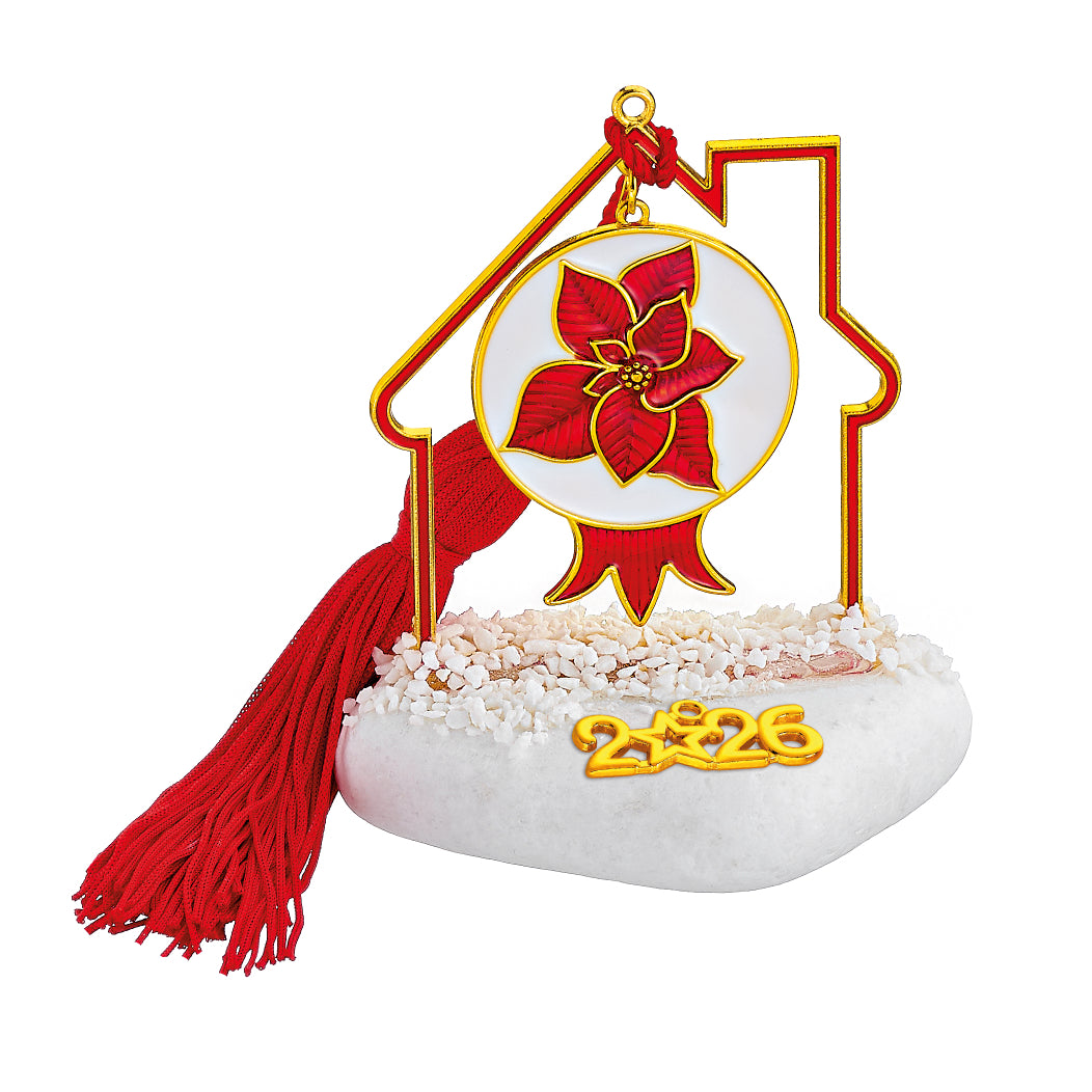 Χειροποίητο Επιτραπέζιο Γούρι 2026 Βότσαλο με μεταλλικό Περίγραμμα Σπιτάκι Κόκκινο σμάλτο, φούντα &  Ρόδι με Αλεξανδρινό κόκκινο και άσπρο σμάλτο περίπου Υ10εκ.