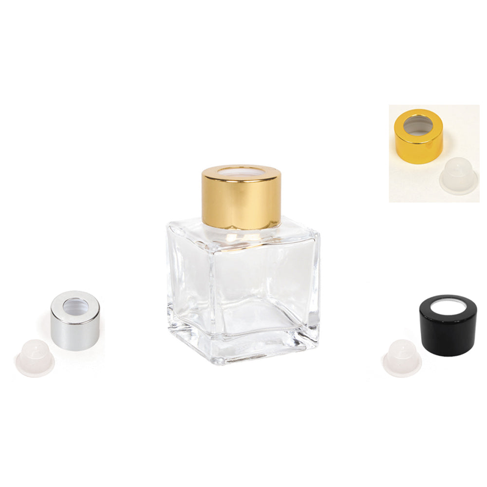 Γυάλινο μπουκαλάκι για αρωματικό χώρου τετράγωνο, με χρυσό ή ασημί καπάκι. Η χωρητικότητα του γυάλινου μπουκαλιού είναι 50ml, ενώ η διάσταση του είναι 5Χ6,5εκ.