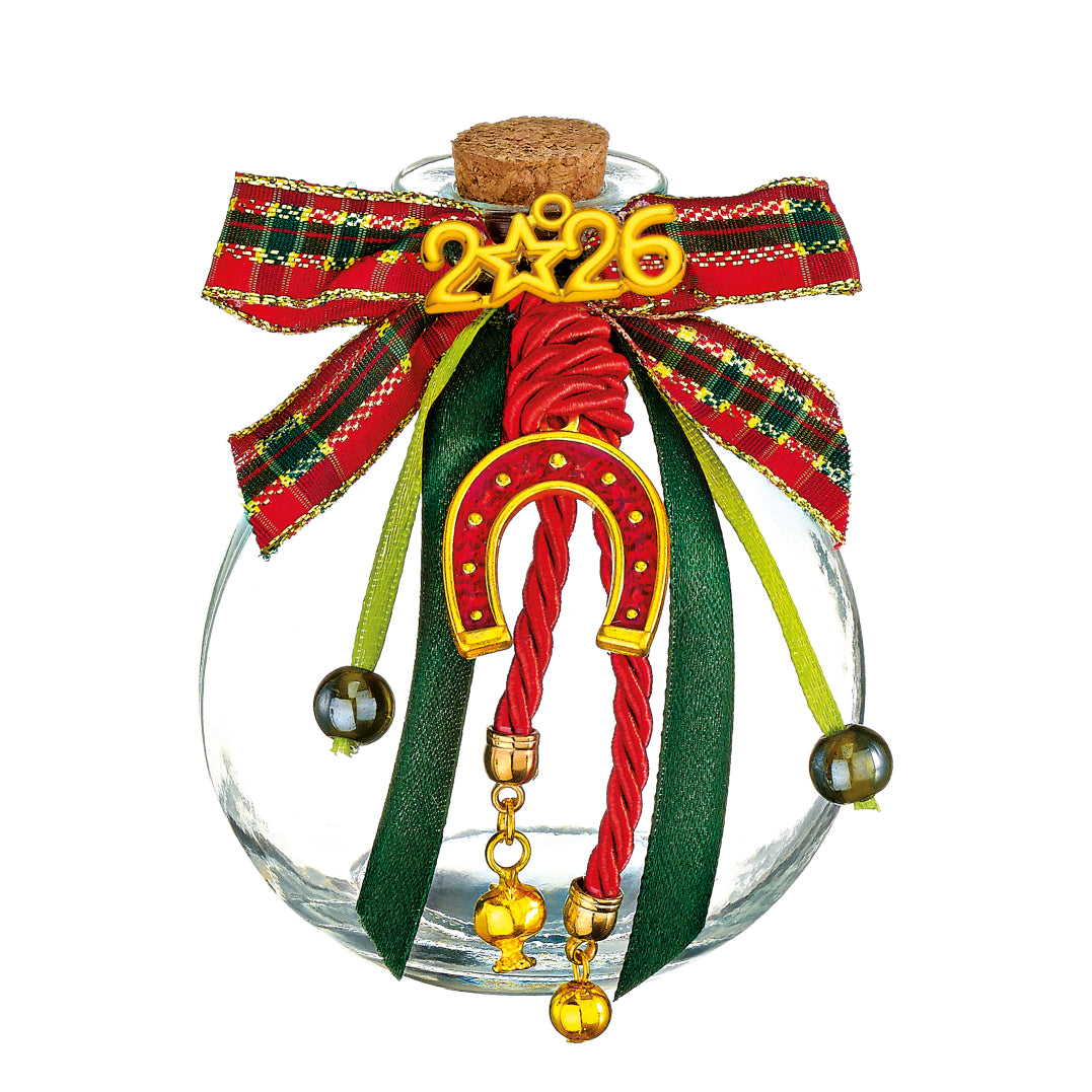 Χειροποίητο γούρι 2026 σε γυάλινο βαζάκι, στολισμένο με κορδέλες και μεταλλικά στοιχεία τύχης. Ιδανικό εταιρικό δώρο για πελάτες ή συνεργάτες, που συνδυάζει κομψότητα και συμβολισμό.Η διάσταση της είναι 8,8Χ10,3εκ.