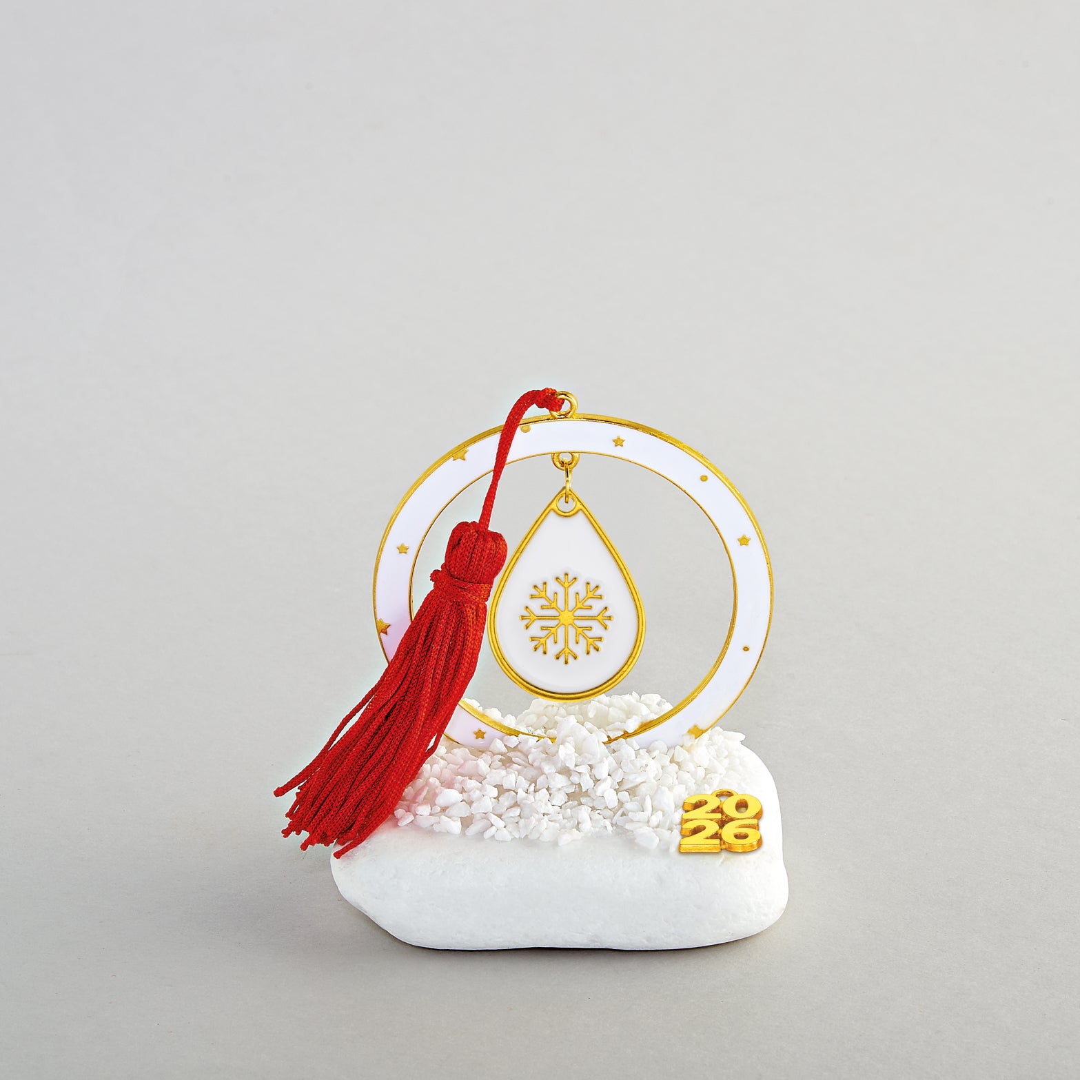 Κομψό χειροποίητο γούρι 2026 σε πέτρα Δάκρυ με Χιονονιφάδα & Άσπρο Κύκλο. Ιδανικό εταιρικό δώρο για πελάτες, συνεργάτες ή προσωπικό. Προσφέρει συμβολισμό τύχης και διακριτική πολυτέλεια, με ελληνική αισθητική.