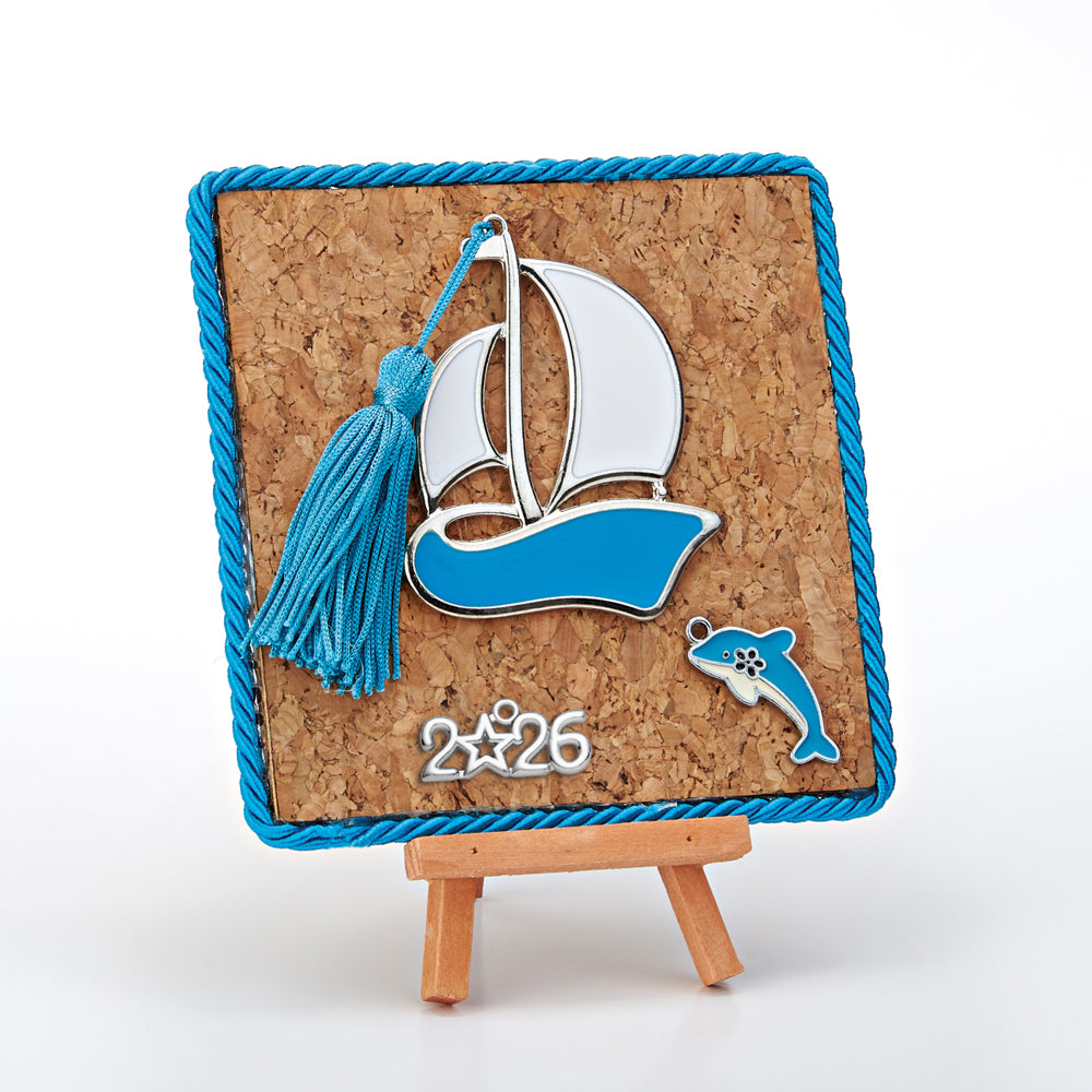 Eπιτραπέζιο Γούρι 2026 Πίνακας Φελλού 11εκ σε Καβαλέτο & Μεταλλικός Καράβι 6Χ7 εκ. Συνολικό Ύψος περίπου 14εκ.