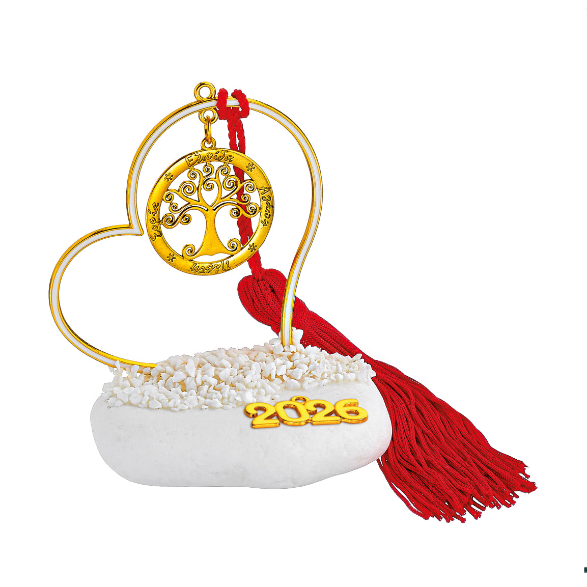 Χειροποίητο Επιτραπέζιο Γούρι 2026 Βότσαλο με μεταλλικό Περίγραμμα Καρδιά Άσπρη σμάλτο, φούντα & Δέντρο Ζωής με Ευχές Χρυσό χρώμα περίπου Υ10εκ.
