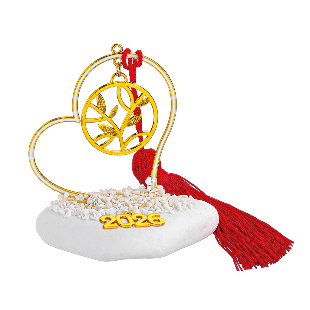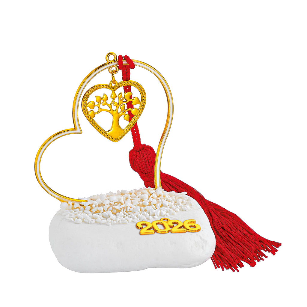 Χειροποίητο γούρι καρδιά 2026 σε φυσική πέτρα με κόκκινο ή λευκό σμάλτο και μεταλλικά στοιχεία. Ένα ζεστό δώρο Χριστουγέννων & Πρωτοχρονιάς για αγάπη και τύχη.