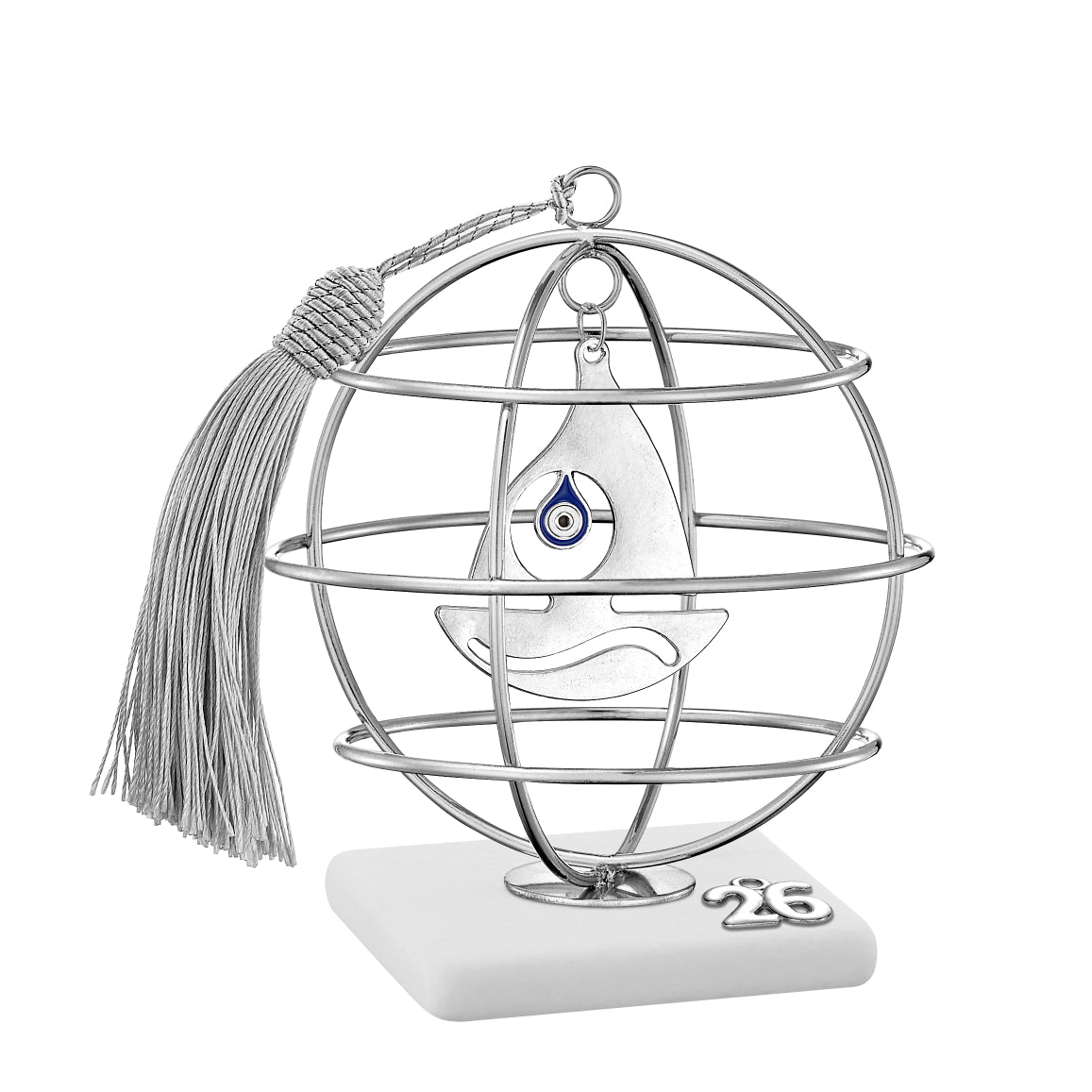 Γούρι 2026 Καράβι με μάτι σε Ασημί Σφαίρα & Φούντα- Χειροποίητο Διακοσμητικό Υ13εκ.