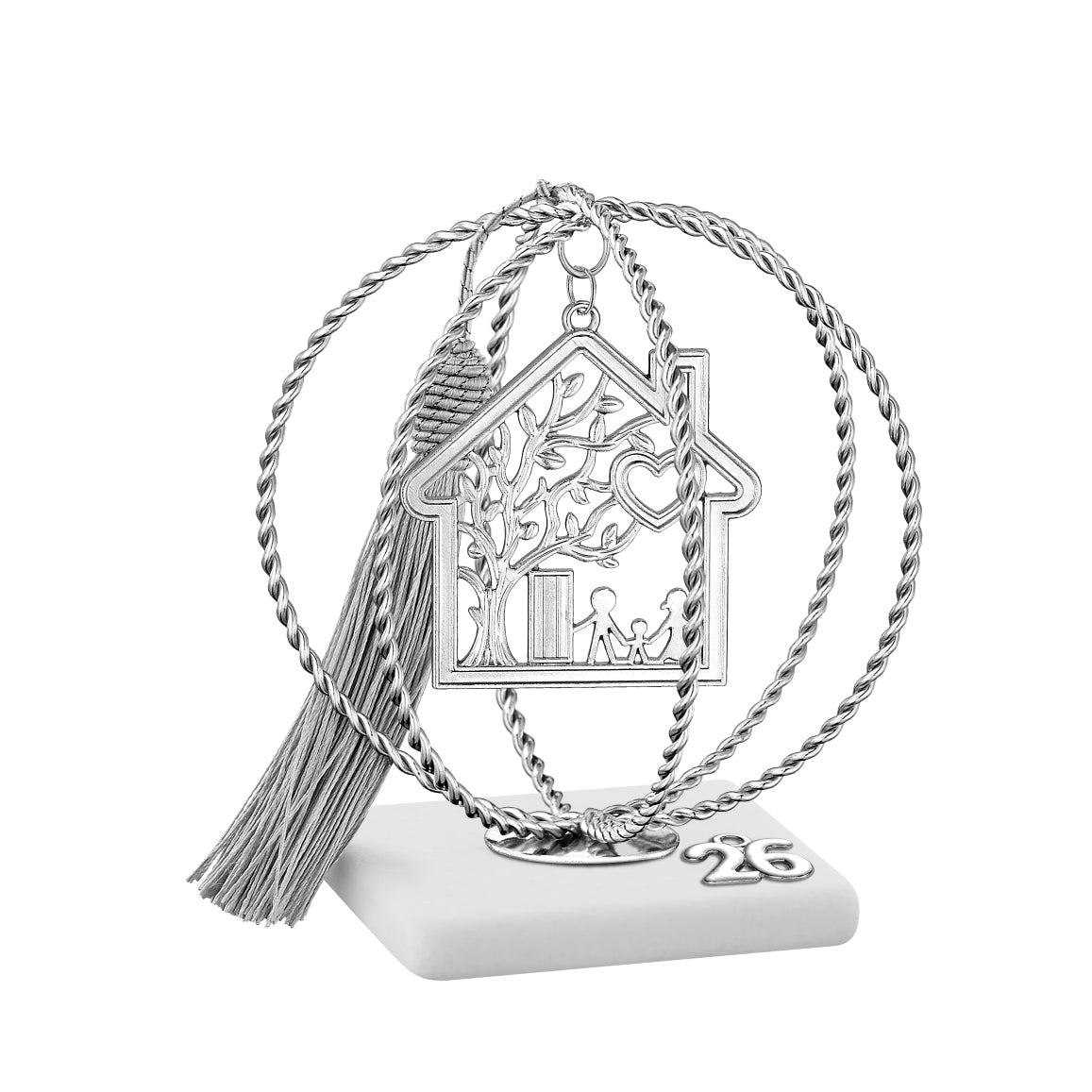 Χειροποίητο γούρι 2026 με μεταλλικό Σπιτάκι με οικογένεια, σε Μεταλλική Σφαίρα Πλεξούδες ασημί & Μαρμάρινη Βάση συμβολίζει την ασφάλεια, την ευημερία και τη ζεστασιά του σπιτιού για τη νέα χρονιά.
