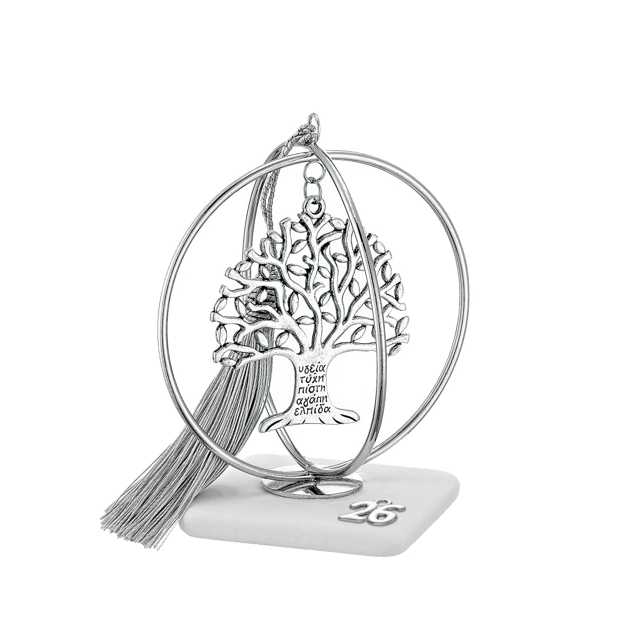 Χειροποίητο Επιτραπέζιο Γούρι 2026 σε φυσικό Μάρμαρο 7x7x1εκ με μεταλλικό χρυσό Τ. Κλουβί 10X12εκ & μεταλλικό Δέντρο Ζωής με Ευχές ασημί 7Χ7εκ και φούντα. Συνολικό ύψος περίπου Υ13εκ.