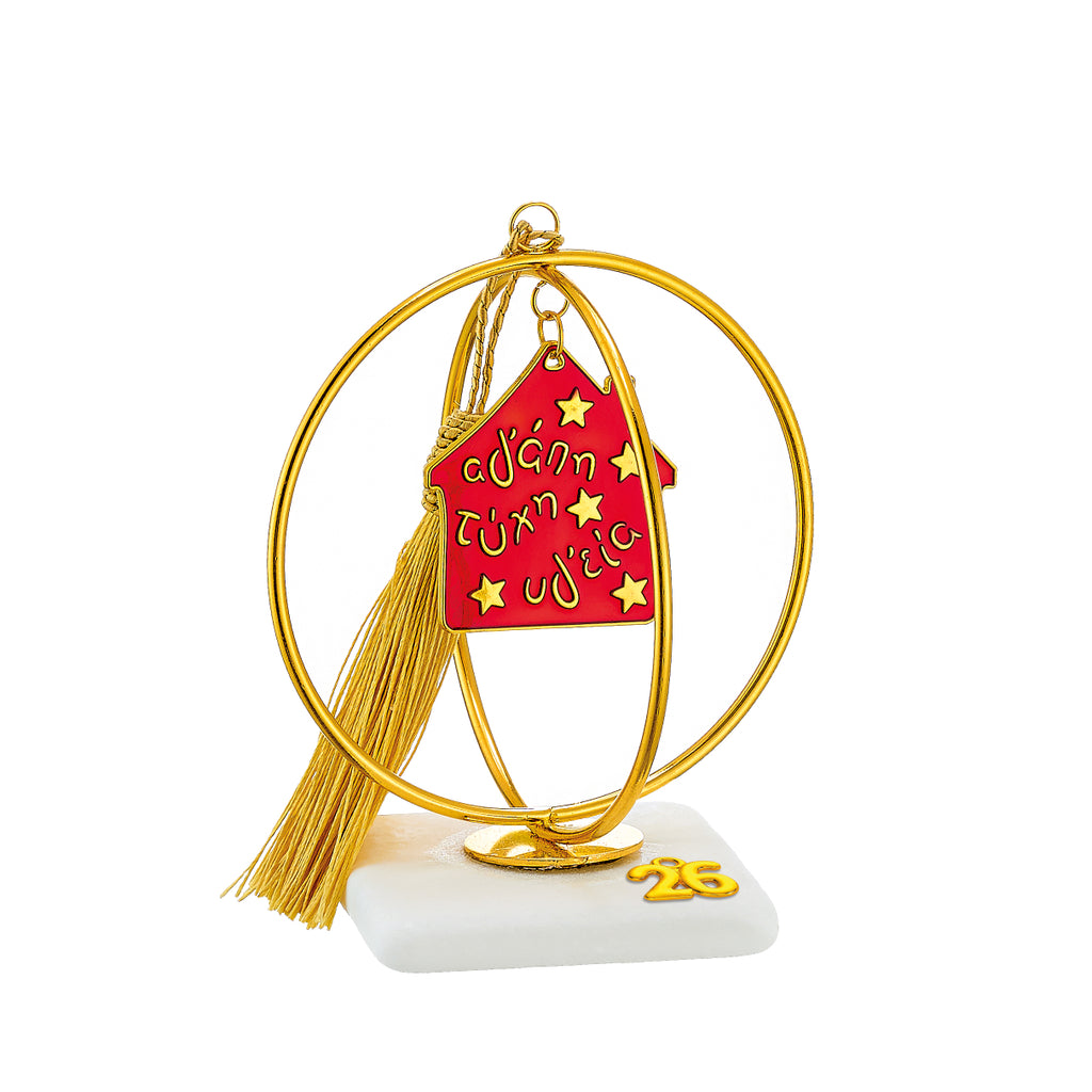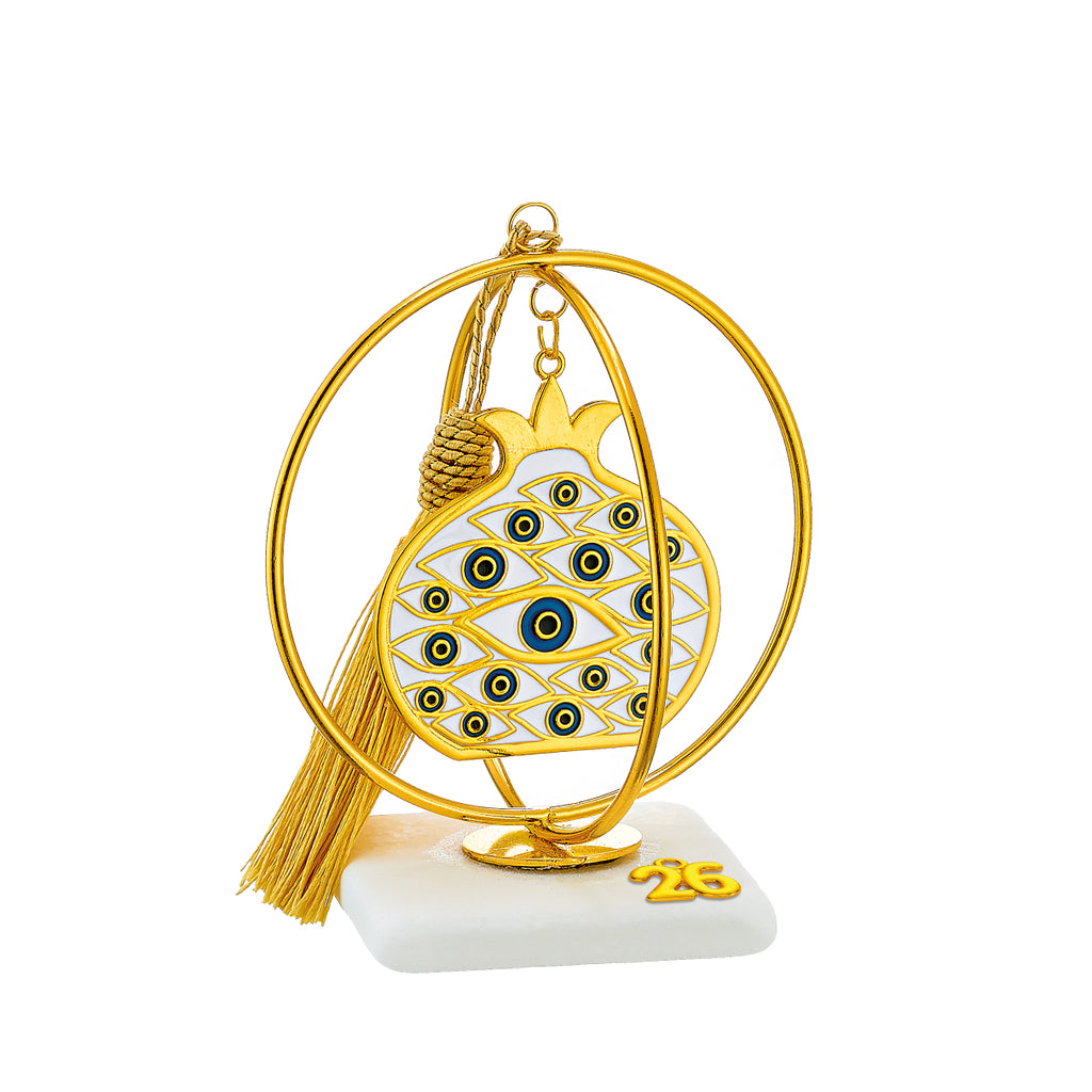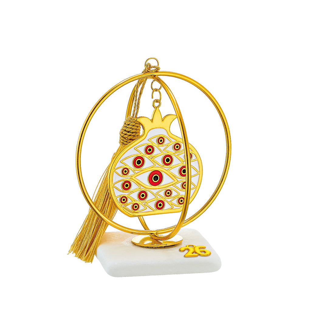 Γούρια 2026 με τετράγωνη μαρμάρινη βάση και εντυπωσιακή σφαίρα–κλουβί που αγκαλιάζει ένα μεταλλικό στοιχείο. Ένας ξεχωριστός συνδυασμός φυσικής πέτρας και κομψών λεπτομερειών που χαρίζει στα γούρια ιδιαίτερο χαρακτήρα. Ιδανικά για Χριστούγεννα και Πρωτοχρονιά, στολίζουν με στυλ το σπίτι ή το γραφείο και συνοδεύουν τις ευχές για το νέο έτος.