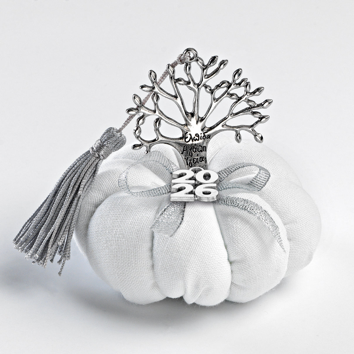 Χειροποίητη Κολοκύθα υφασμάτινη Γούρι 2026 με μεταλλικό Δέντρο με Ευχές, σε Ασημί χρώμα και φούντα περίπου Δ9εκ.