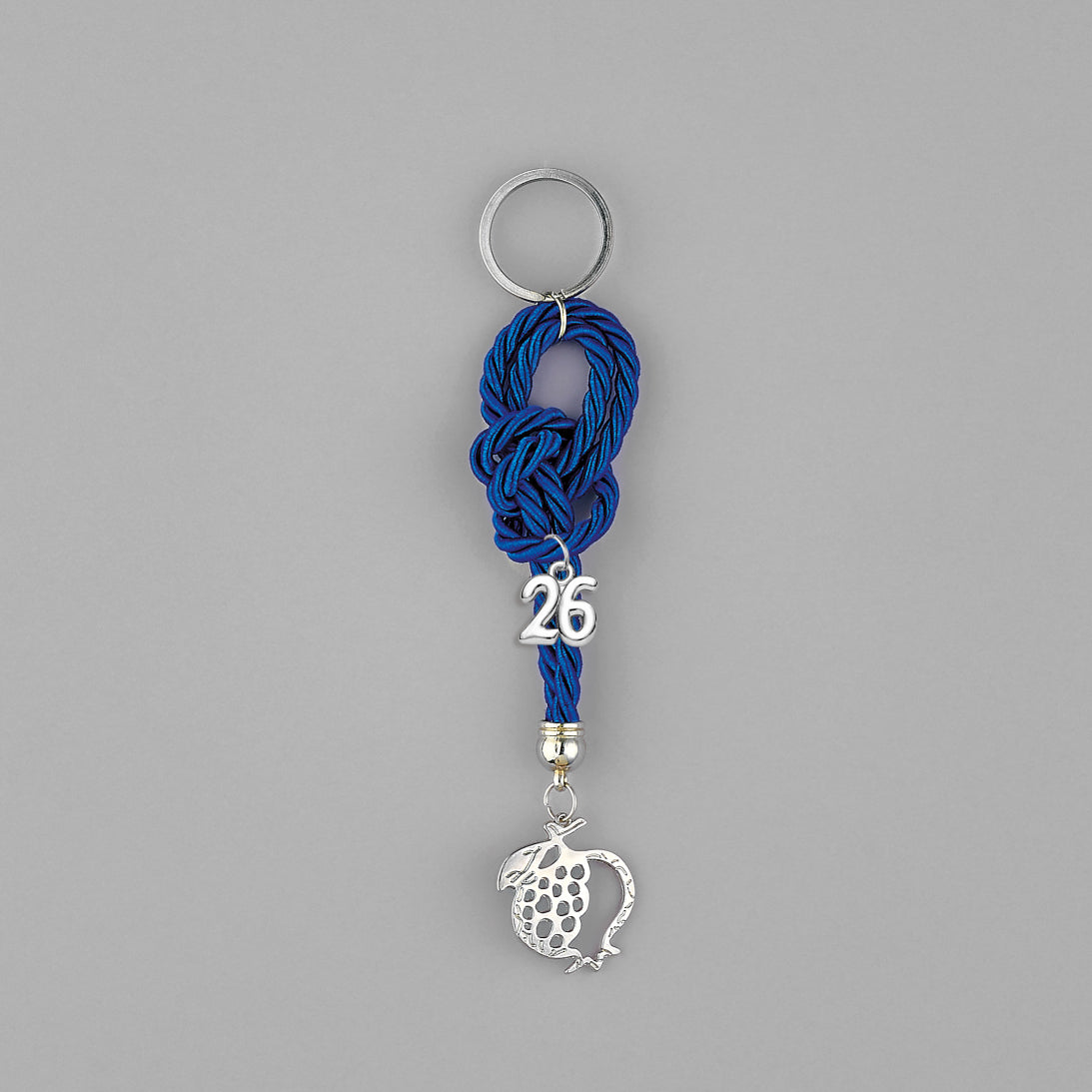 Χειροποίητο Γούρι 2026 Κρεμαστό Μπρελόκ κορδόνι με δέσιμο, Μεταλλικό Ρόδι Διάτρητο ασημί χρώμα 2,8Χ3εκ. Συνολικό ύψος περίπου 13εκ.