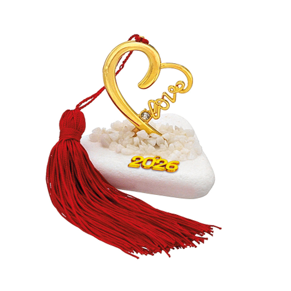 Χειροποίητο γούρι 2026, επιτραπέζιο διακοσμητικό σε πέτρα, καρδιά με στρας που γράφει επάνω τη λέξη love σε χρυσό χρώμα και κόκκινη φούντα, περίπου Υ9εκ.