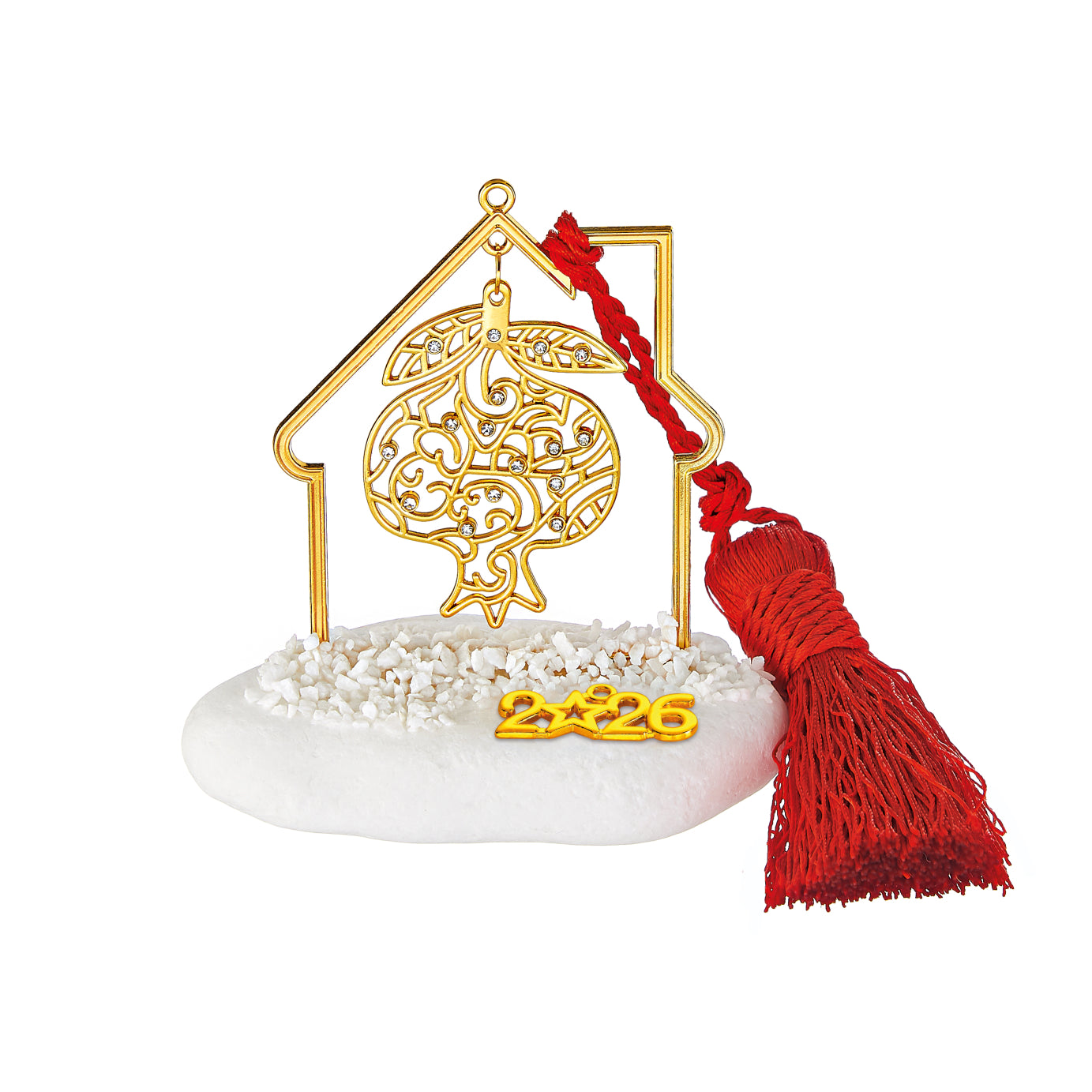 Χειροποίητο Επιτραπέζιο Γούρι 2026 βότσαλο με μεταλλικό Περίγραμμα Σπιτάκι , φούντα & Ρόδι με Στρας χρυσό χρώμα περίπου Υ10εκ.