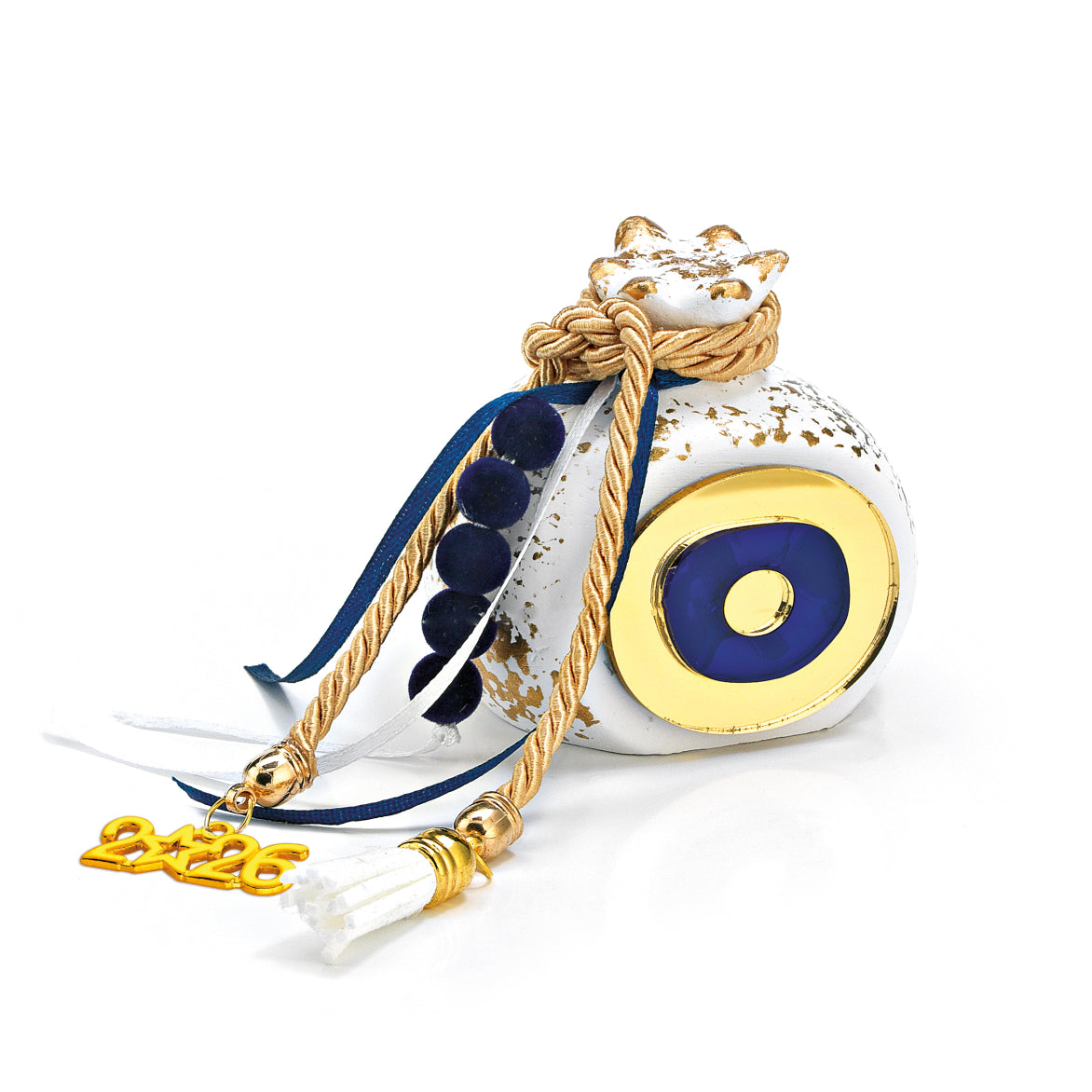 Κεραμικό Ρόδι επιτραπέζιο Γούρι 2026 Άσπρο Χρυσό με Μάτι Plexiglass Μπλε εκ.
