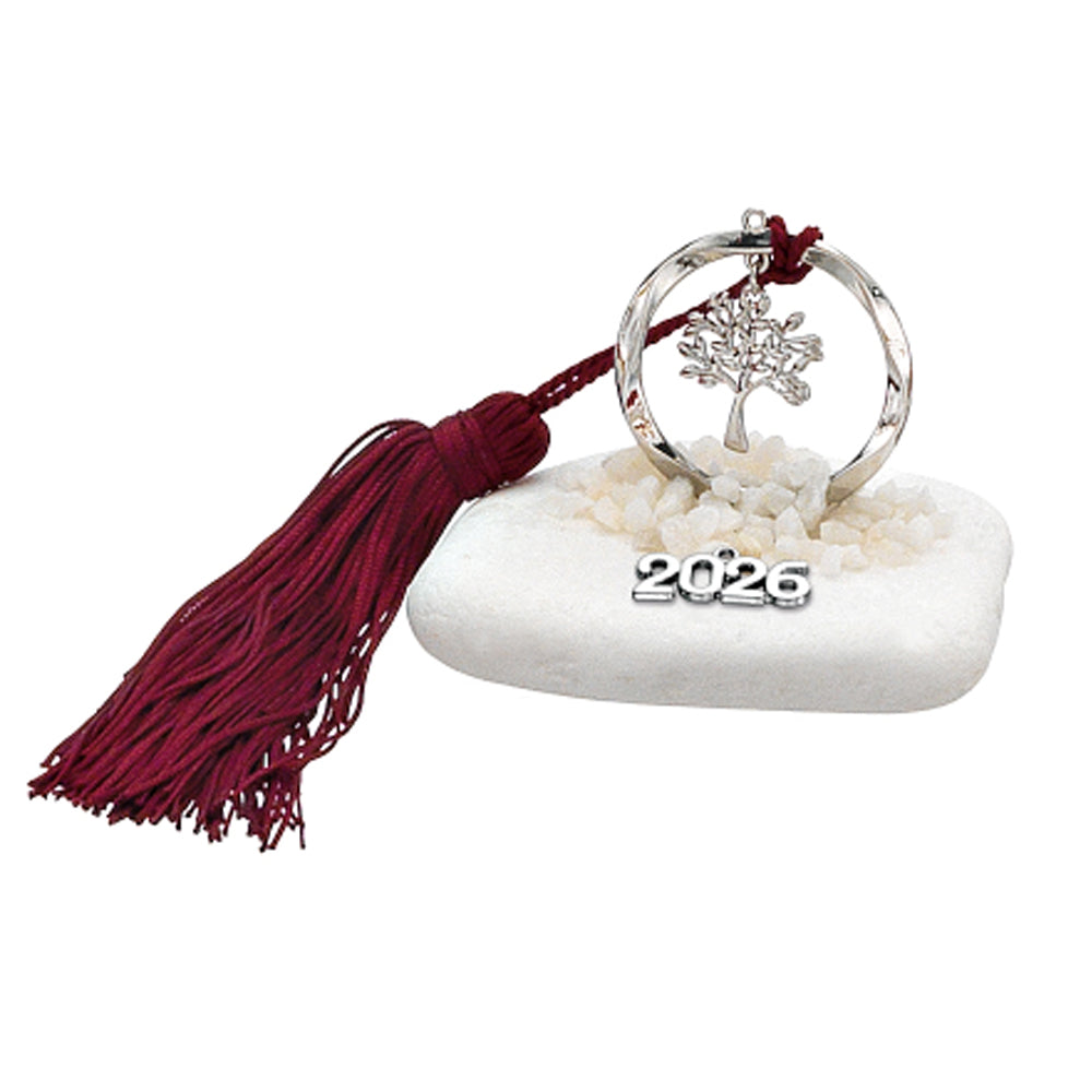 Χειροποίητο γούρι 2026 , επιτραπέζιο διακοσμητικό σε πέτρα, δέντρο ζωής σε κύκλο, σε Ασημί χρώμα και κόκκινη φούντα, περίπου Υ7εκ.