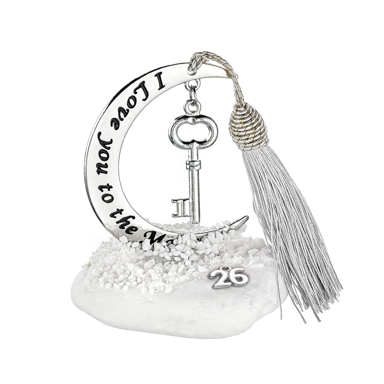Χειροποίητο Επιτραπέζιο Γούρι 2026 σε βότσαλο με μεταλλικό ασημί Μισοφέγγαρο I love you to the moon 7X8εκ & μεταλλικό Κλειδί ασημί χρώμα 1,9Χ5,1εκ και φούντα. Συνολικό ύψος περίπου Υ10εκ.