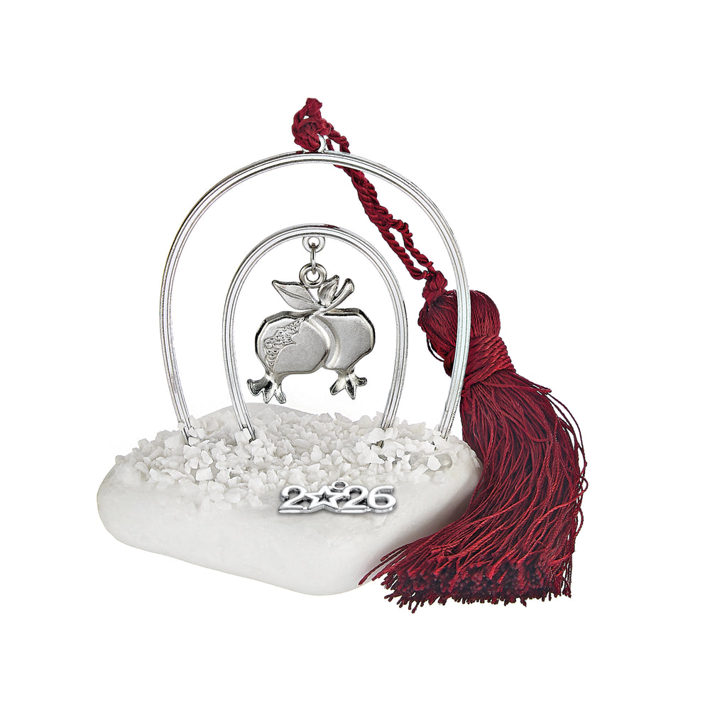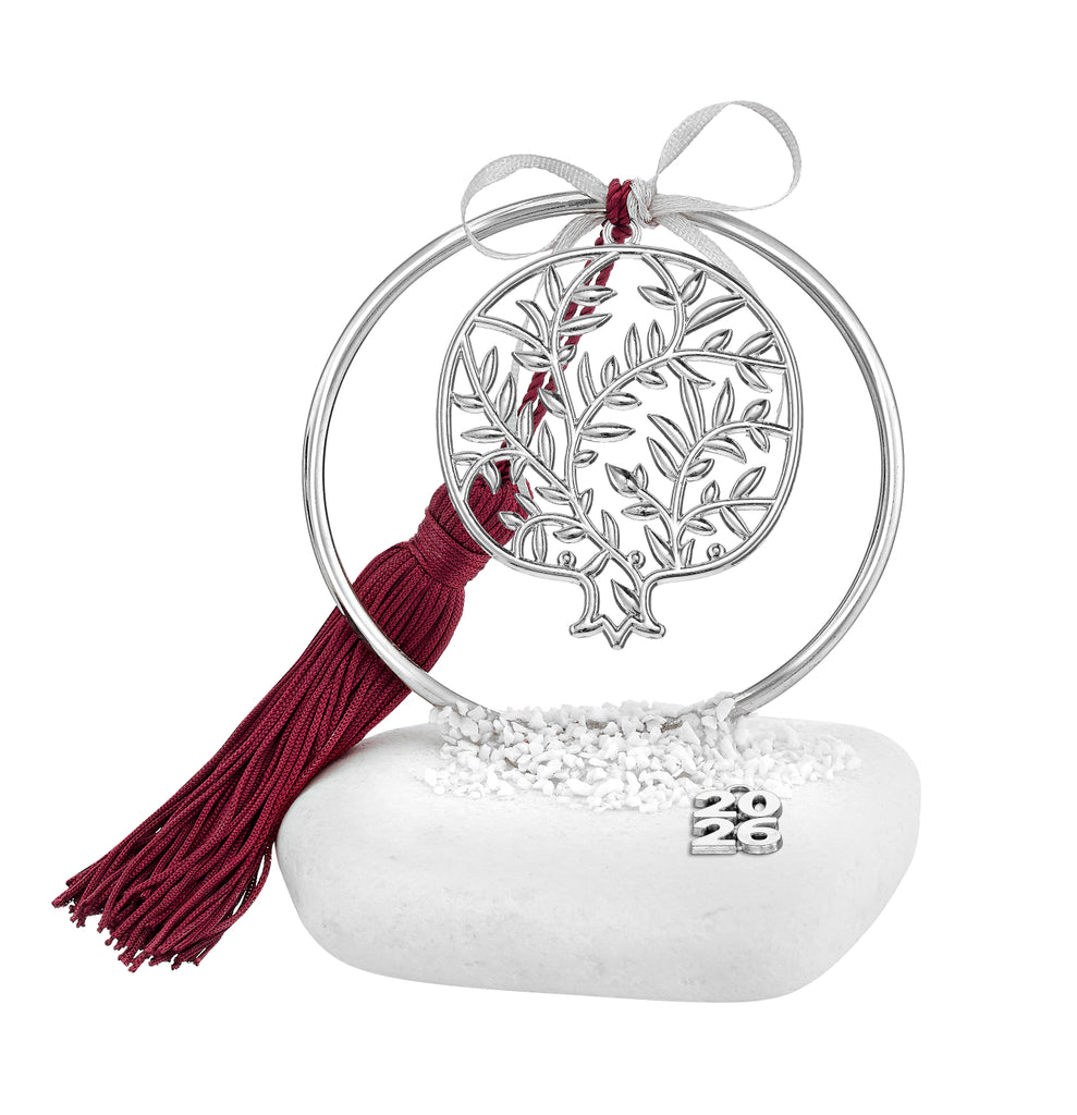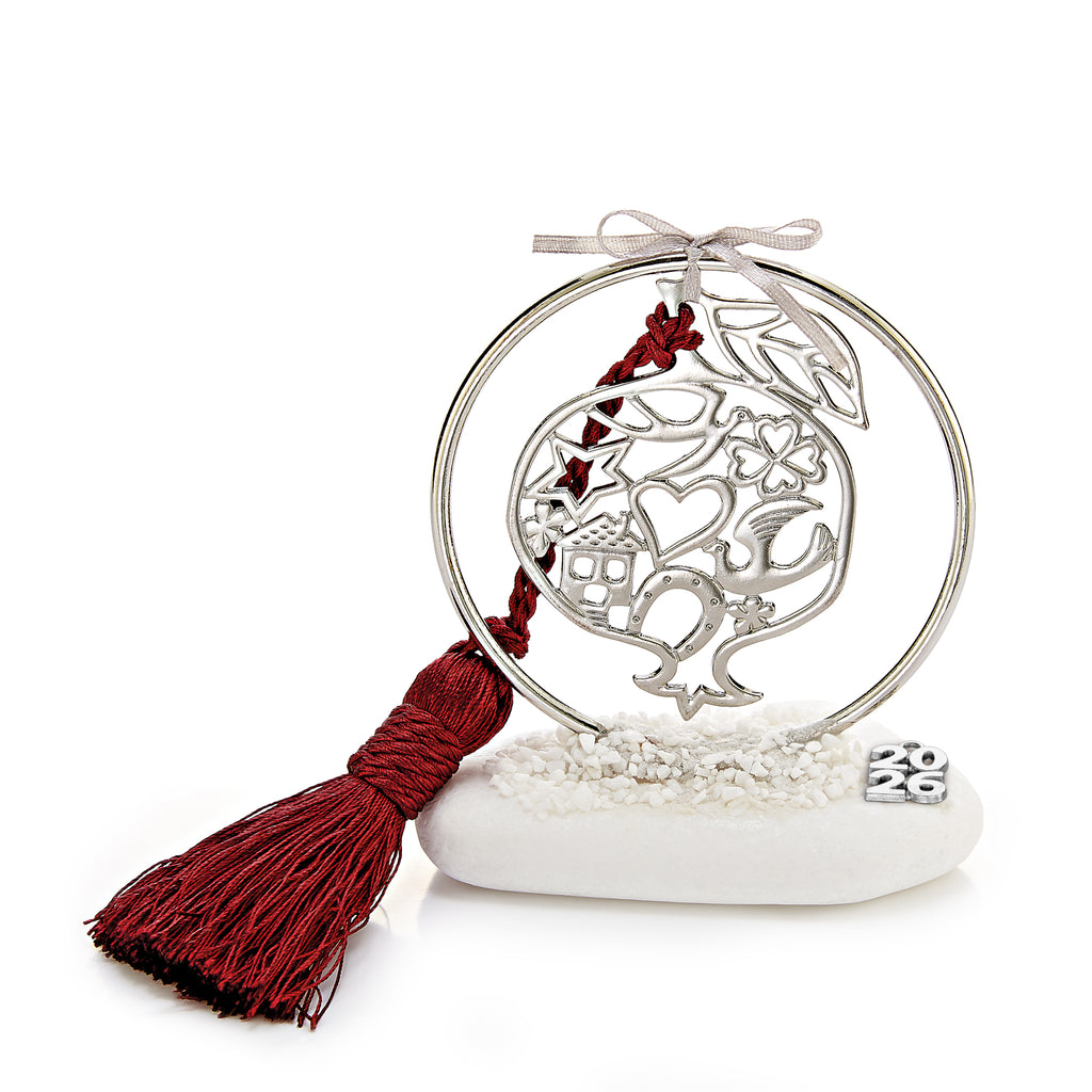 Χειροποίητο Γούρι 2026 Ρόδι με κλαδία ασημί σε κύκλο & Φούντα σε Πέτρα Υ12εκ.