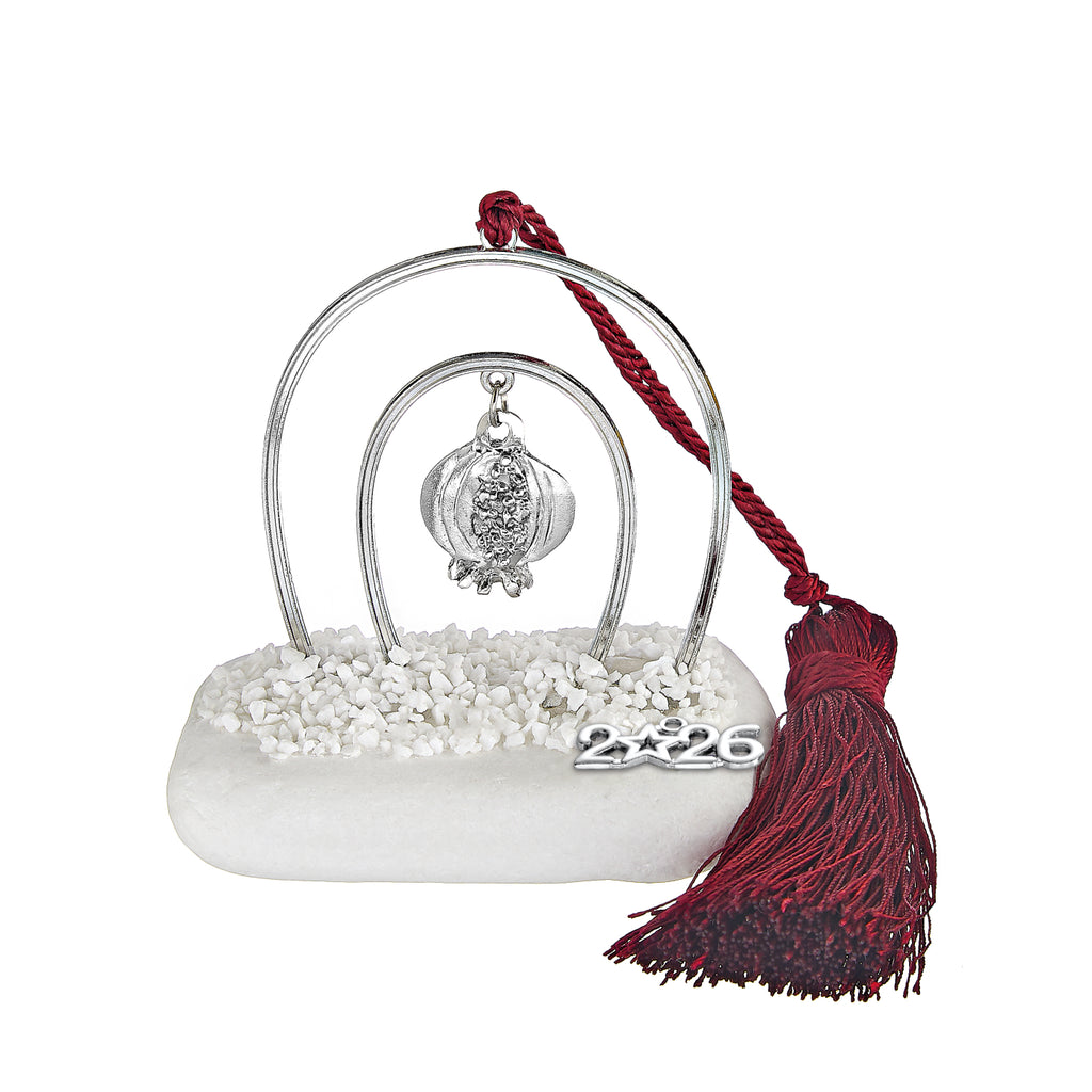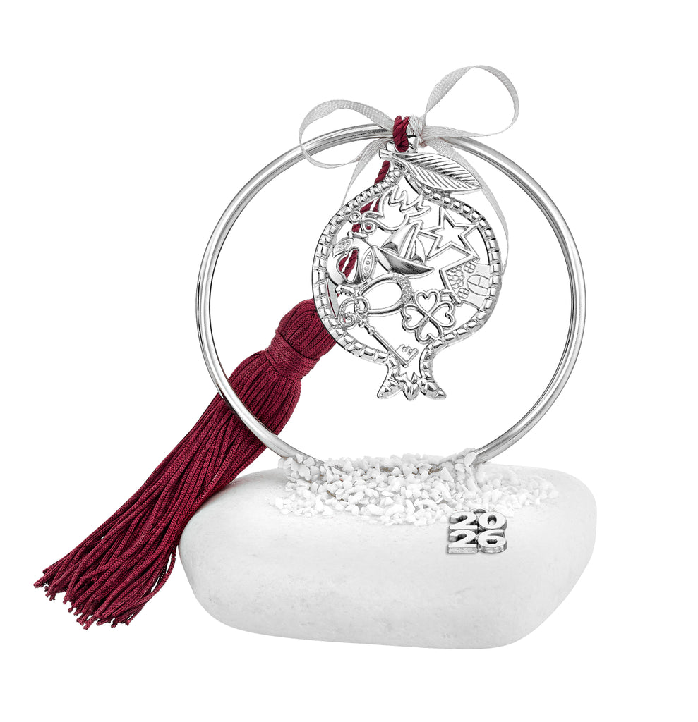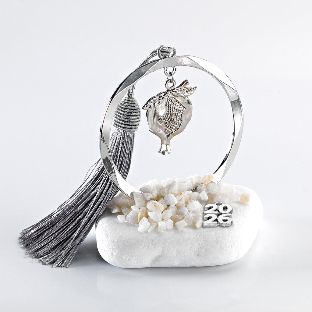 Χειροποίητο Γούρι 2026 Ρόδι ασημί σε κύκλο & Φούντα σε Πέτρα Υ12εκ.