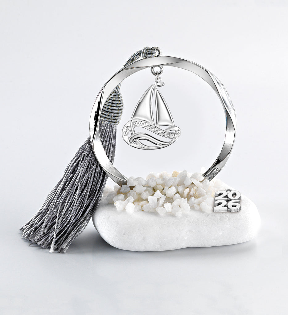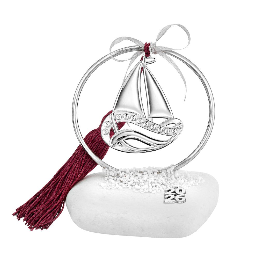 Χειροποίητο Γούρι 2026 Καράβι ασημί σε κύκλο & Φούντα σε Πέτρα Υ12εκ.