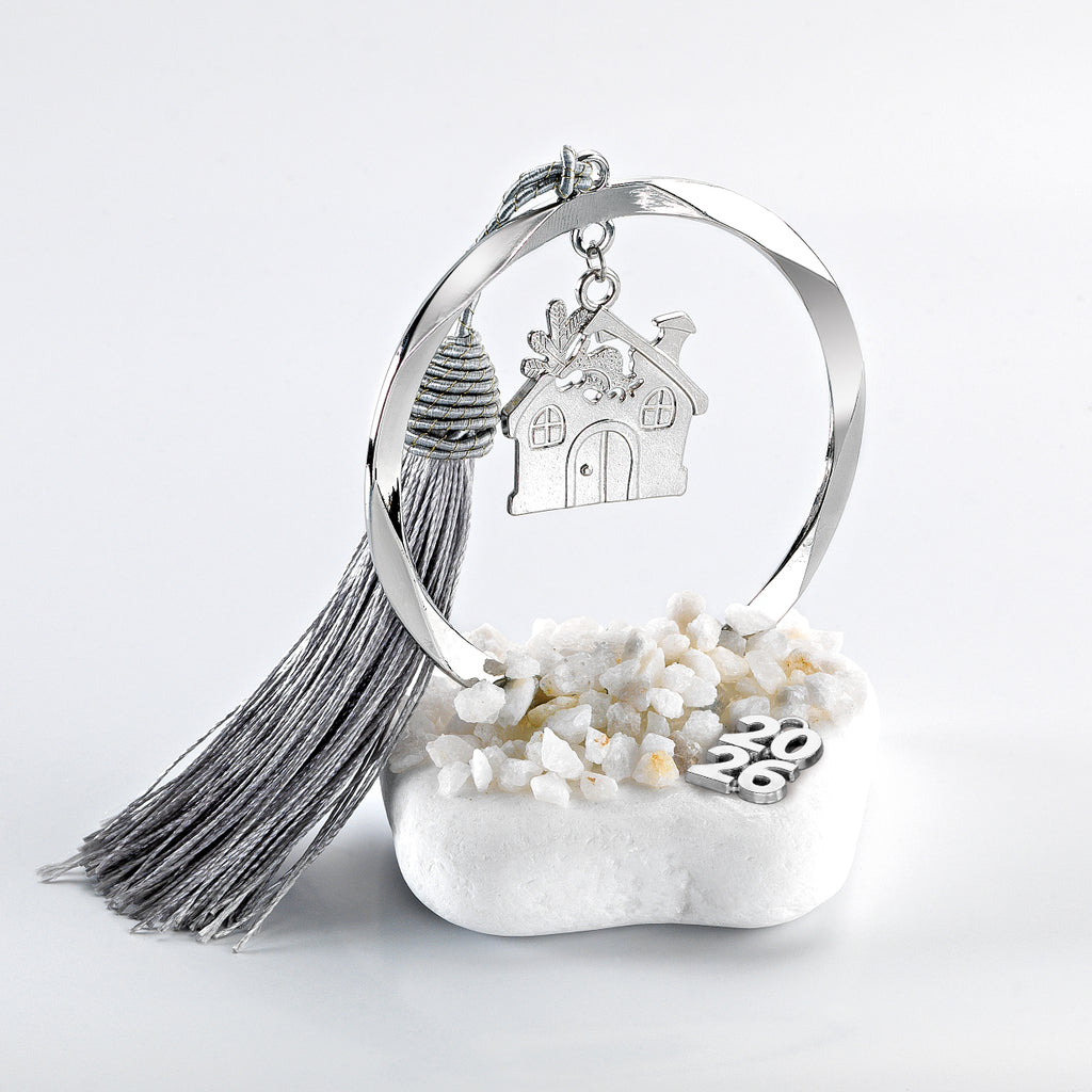Χειροποίητο Επιτραπέζιο Γούρι 2026 βότσαλο με κύκλο & Σπιτάκι μεγάλο Ασημί Υ9εκ.