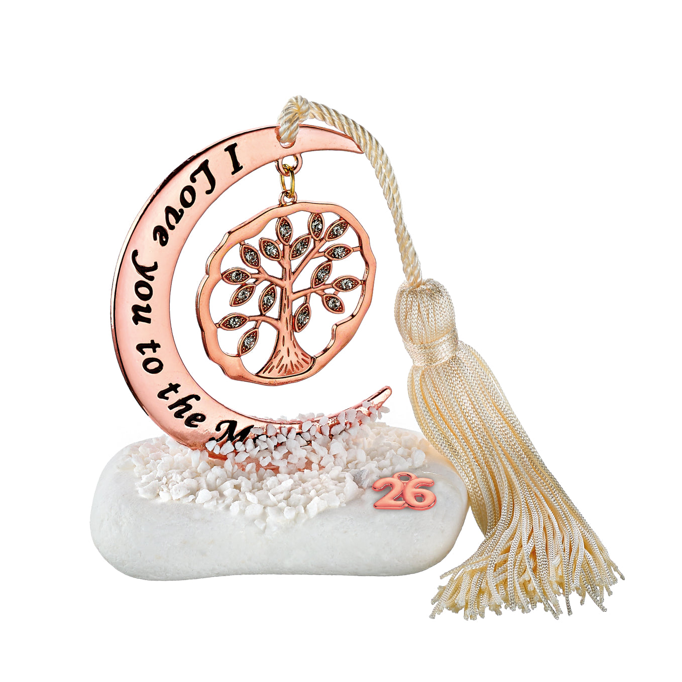 Χειροποίητο Επιτραπέζιο Γούρι 2026 σε βότσαλο με μεταλλικό ροζ χρυσό Μισοφέγγαρο I love you to the moon 7X8εκ & μεταλλικό Δέντρο με Στρας σε Κύκλο ροζ χρυσό χρώμα 4.5Χ4.5εκ και φούντα. Συνολικό ύψος περίπου Υ10εκ.