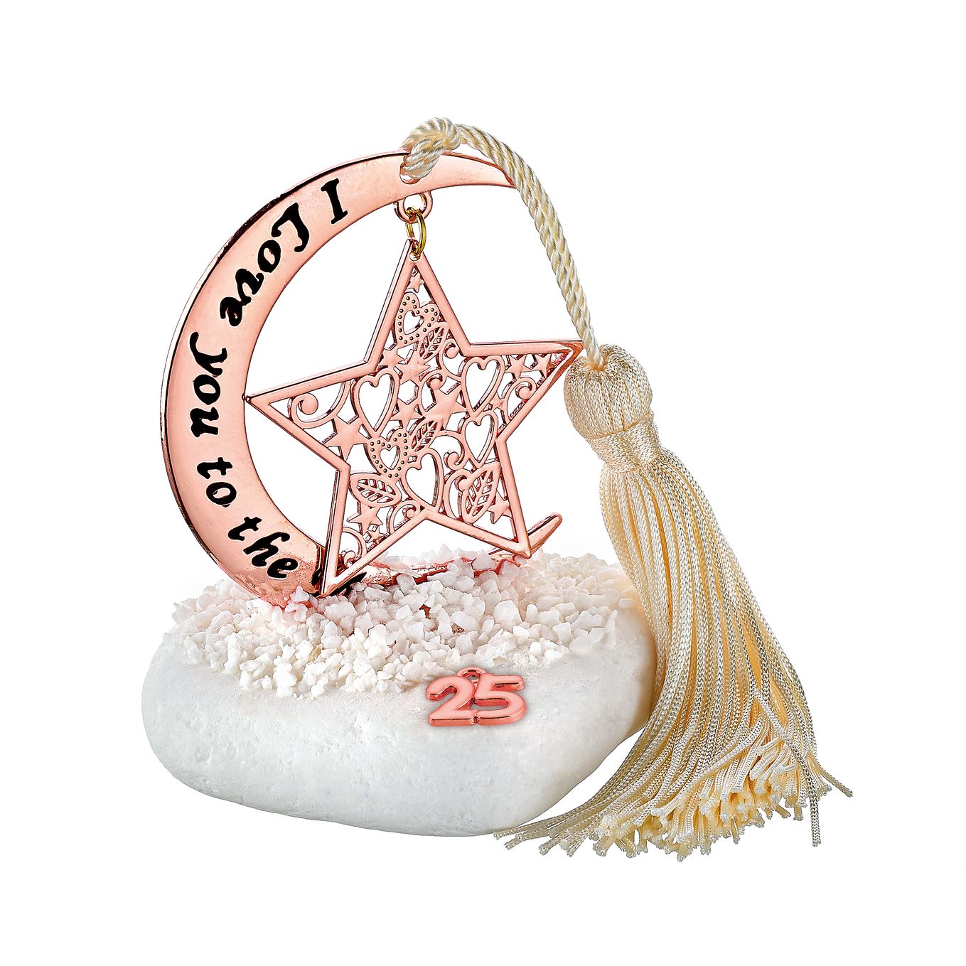 Χειροποίητο Επιτραπέζιο Γούρι 2026 σε βότσαλο με μεταλλικό ροζ χρυσό Μισοφέγγαρο I love you to the moon 7X8εκ & μεταλλικό Αστέρι ροζ χρυσό χρώμα 6Χ6εκ και φούντα. Συνολικό ύψος περίπου Υ10εκ.