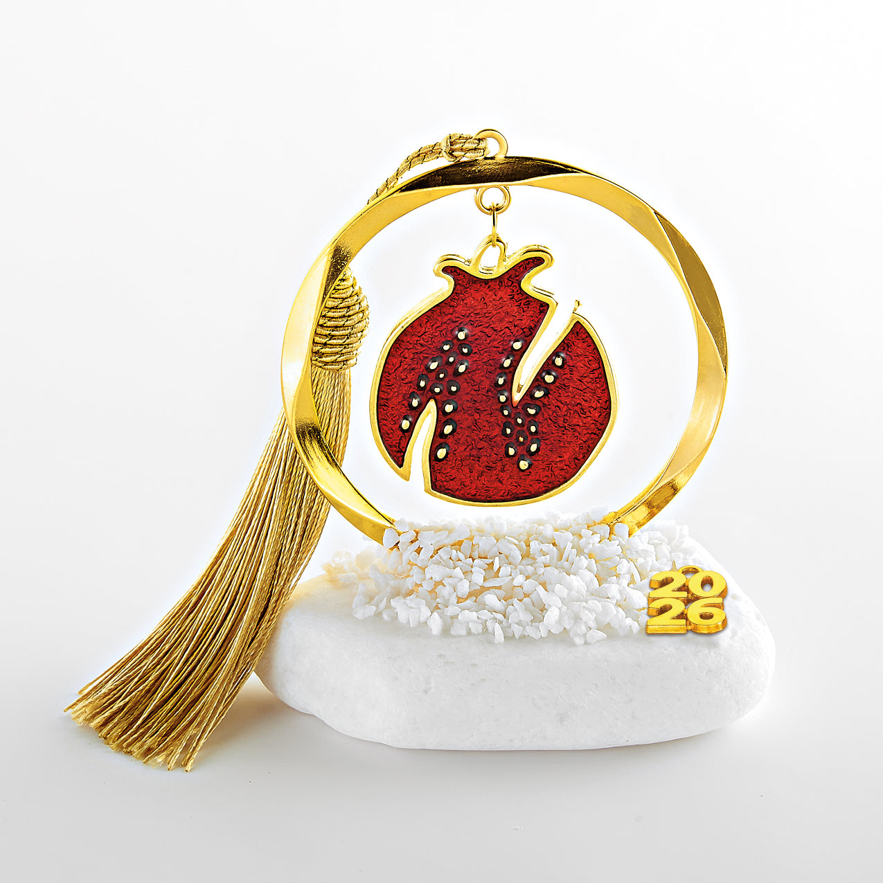Χειροποίητο Επιτραπέζιο Γούρι 2026 βότσαλο με μεταλλικό κύκλο, φούντα & Ρόδι Μπορντό περίπου Υ9εκ.