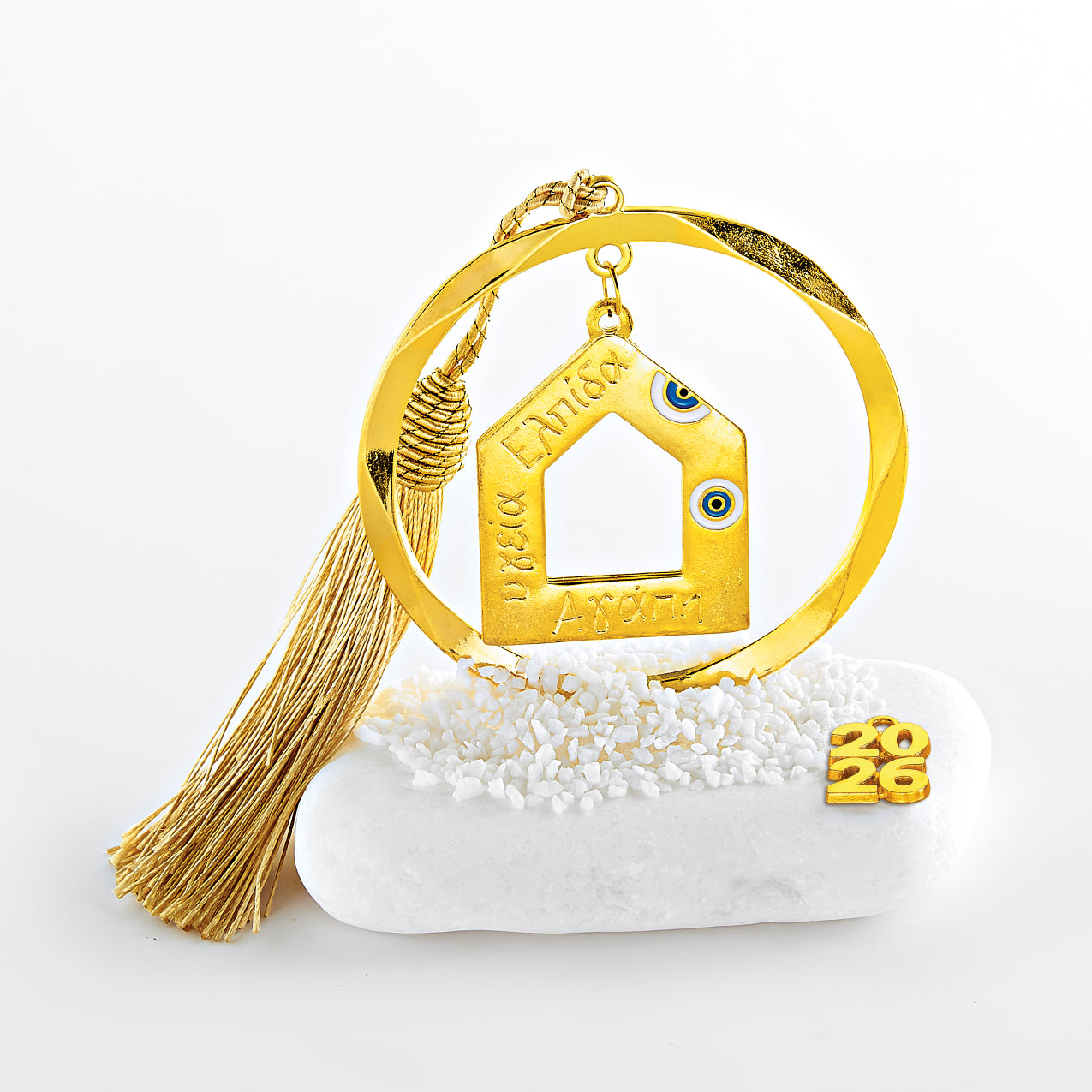 Χειροποίητο Επιτραπέζιο Γούρι 2026 βότσαλο με μεταλλικό κύκλο, φούντα & Σπιτάκι με Ευχές και Ματάκια περίπου Υ9εκ.