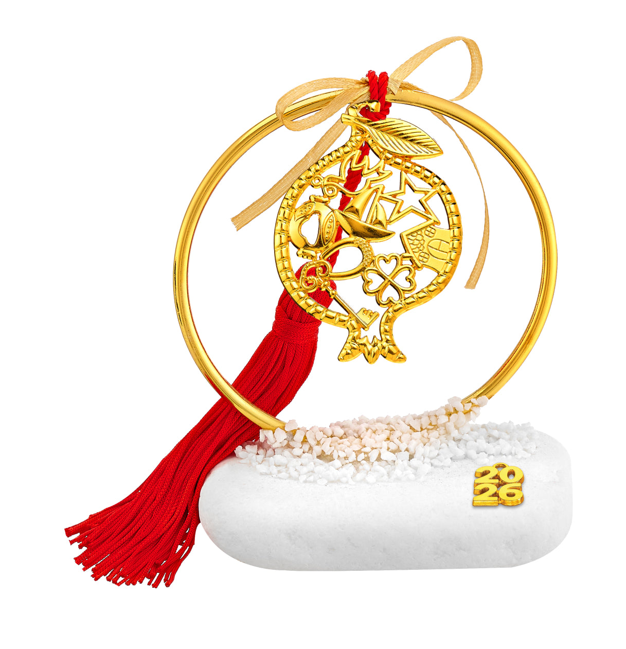Χειροποίητο γούρι 2026 σε βότσαλο Μεταλλικό Ρόδι με σχέδια σε κύκλο Δ10 & Κόκκινη Φούντα. Αυτό το γούρι αποπνέει πολυτέλεια, προστασία και θετική ενέργεια για το νέο έτος.