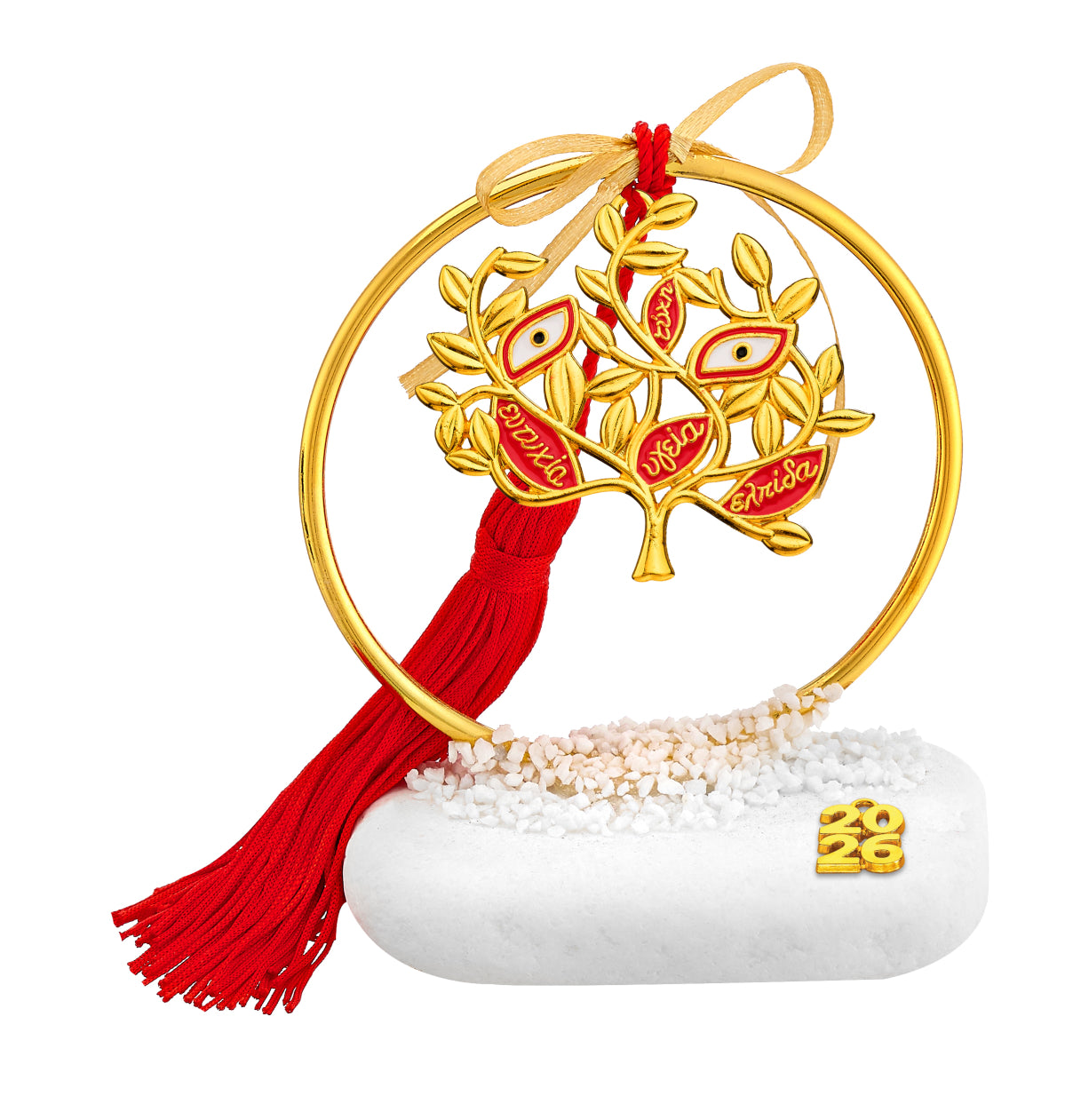 Χειροποίητο γούρι 2026 σε βότσαλο Μεταλλικό Δέντρο με Ματάκια, Ευχές φύλλα κόκκινα σε κύκλο Δ10 & Κόκκινη Φούντα.  Προσφέρει συμβολισμό τύχης και διακριτική πολυτέλεια, με ελληνική αισθητική. Περίπου Υ12εκ.