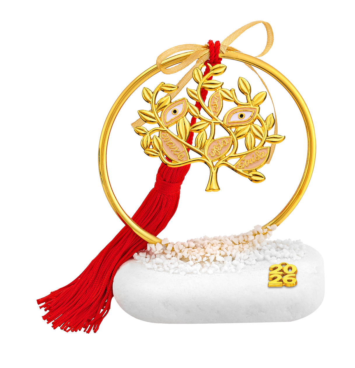 Χειροποίητο γούρι 2026 σε βότσαλο Μεταλλικό Δέντρο με Ματάκια, Ευχές φύλλα σάπιο μήλο σε κύκλο Δ10 & Κόκκινη Φούντα.  Προσφέρει συμβολισμό τύχης και διακριτική πολυτέλεια, με ελληνική αισθητική. Περίπου Υ12εκ.