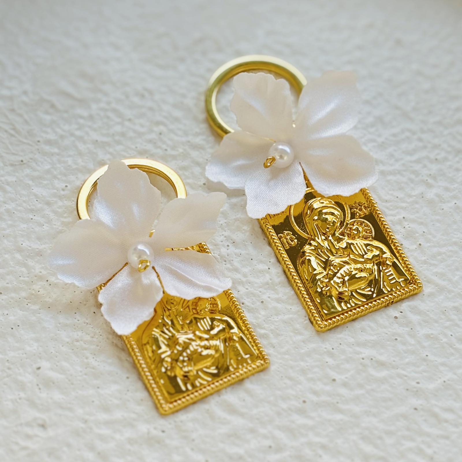 Αφήτεχνο - Μπρελόκ με σατέν λουλούδι, περλίτσα και επίχρυσο πλακέτα ανάγλυφης Παναγίας.