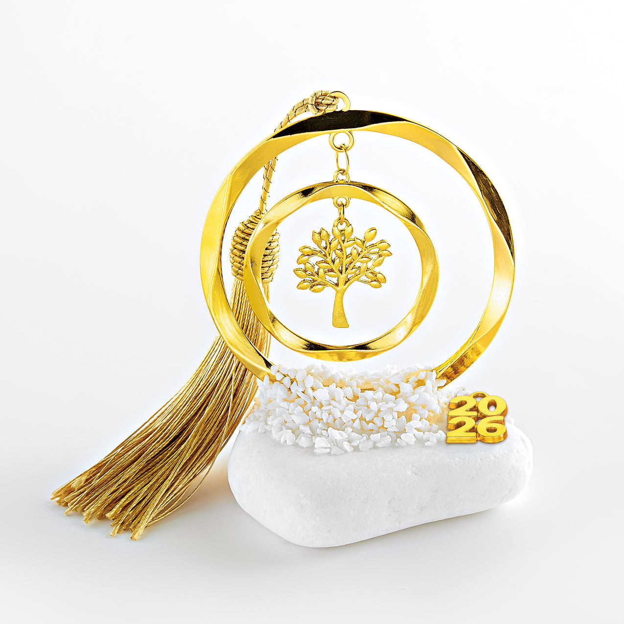 Χειροποίητο Επιτραπέζιο Γούρι 2026 βότσαλο με μεταλλικό κύκλο, φούντα & Δέντρο σε Κύκλο χρυσό περίπου Υ9εκ.