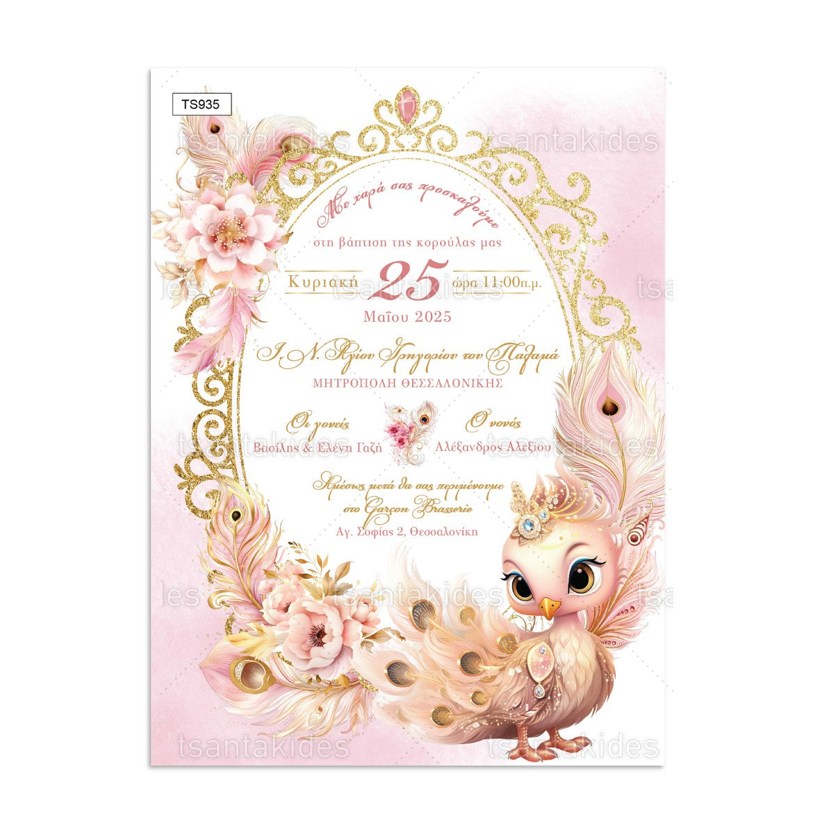 Προσκλητήριο βάπτισης για κορίτσι με θέμα Cute Peacock.