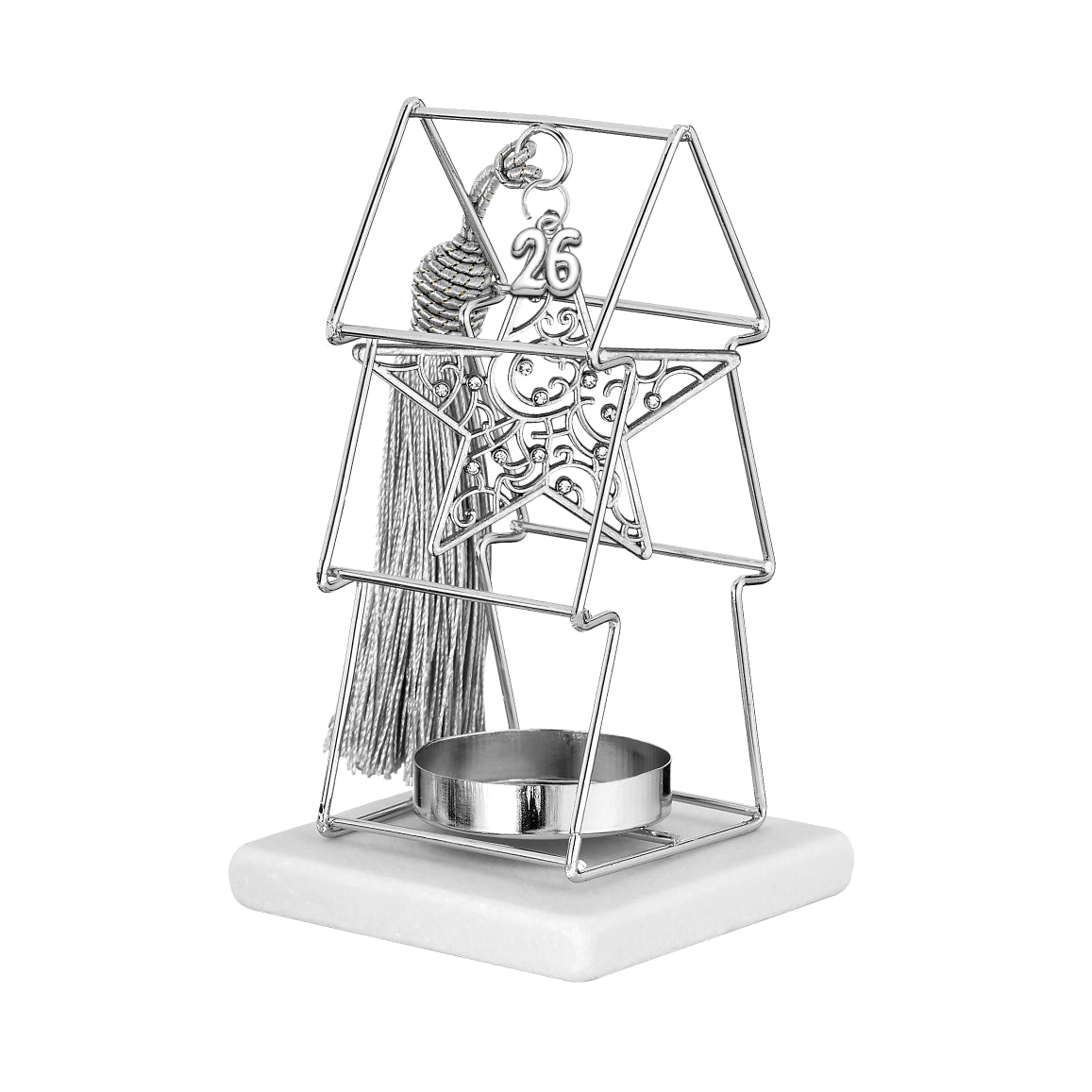 Κομψό και μοντέρνο χειροποίητο γούρι 2026 με μεταλλικό δέντρο σε ασημί φινίρισμα, με αστέρι και διακοσμητική φούντα. Τοποθετημένο σε μαρμάρινη βάση με υποδοχή για ρεσώ, συνδυάζει φως, τύχη και αισθητική. Ιδανικό δώρο για γραφείο ή εταιρικές γιορτές.