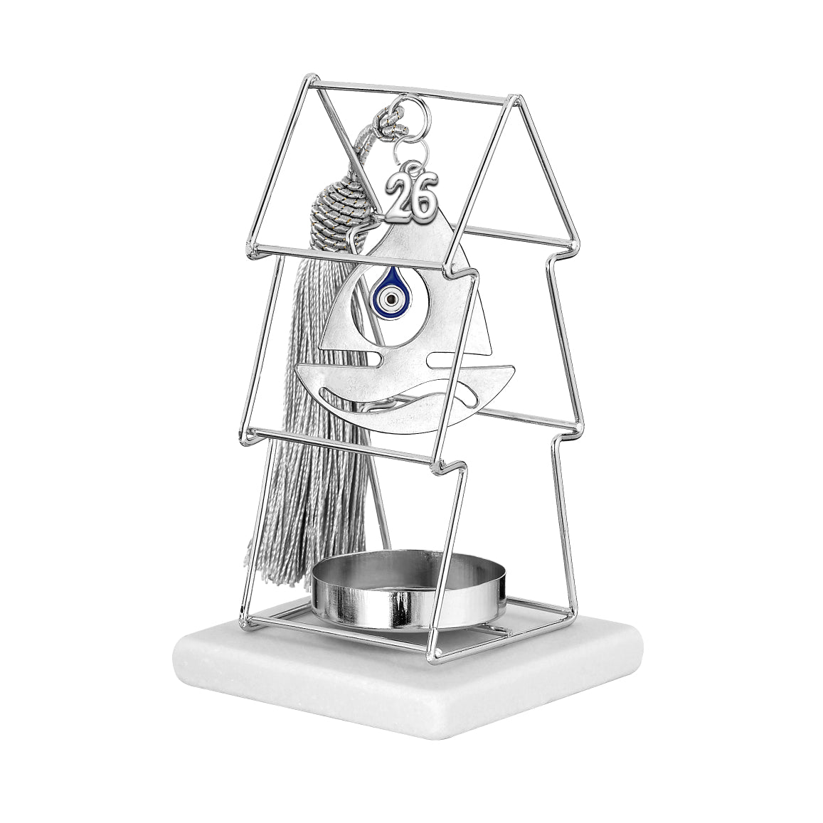 Κομψό και μοντέρνο χειροποίητο γούρι 2026 με μεταλλικό δέντρο σε ασημί φινίρισμα, με καράβι με μάτι και διακοσμητική φούντα. Τοποθετημένο σε μαρμάρινη βάση με υποδοχή για ρεσώ, συνδυάζει φως, τύχη και αισθητική. Ιδανικό δώρο για γραφείο ή εταιρικές γιορτές.