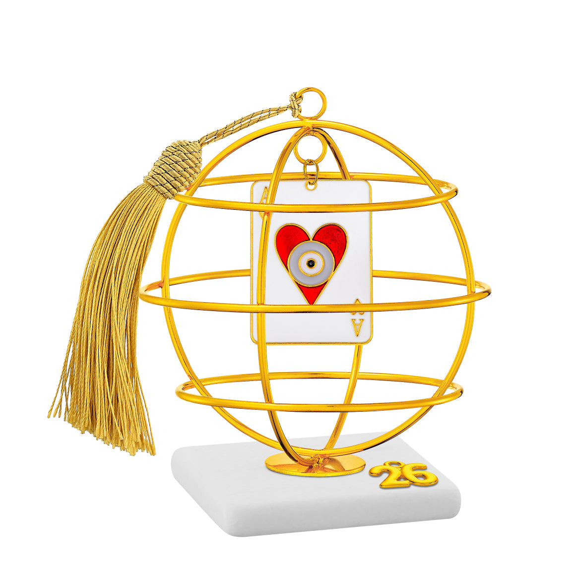 Γούρι 2026 Άσος καρδιά με μάτι σε Χρυσή Σφαίρα & Φούντα- Χειροποίητο Διακοσμητικό Υ13εκ.