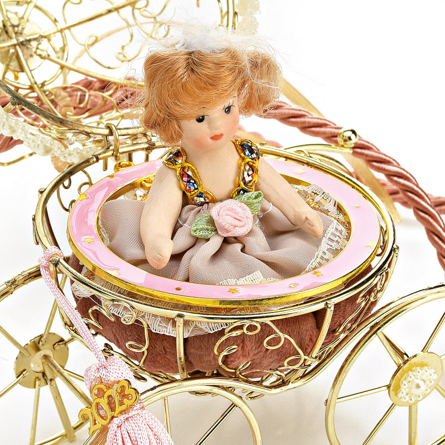 Ένα μοναδικό, χειροποίητο γούρι για το 2026: μεταλλική άμαξα σε χρυσό χρώμα, που στο εσωτερικό της φιλοξενεί μια βελούδινη κολοκύθα σε σάπιο μήλο απόχρωση και μια κομψή φιγούρα vintage κοριτσιού. Ένα κομμάτι με ρομαντική και νοσταλγική αισθητική, εμπνευσμένο από τα παραμύθια, που συμβολίζει τη μεταμόρφωση, τα νέα ξεκινήματα και την καλή τύχη.