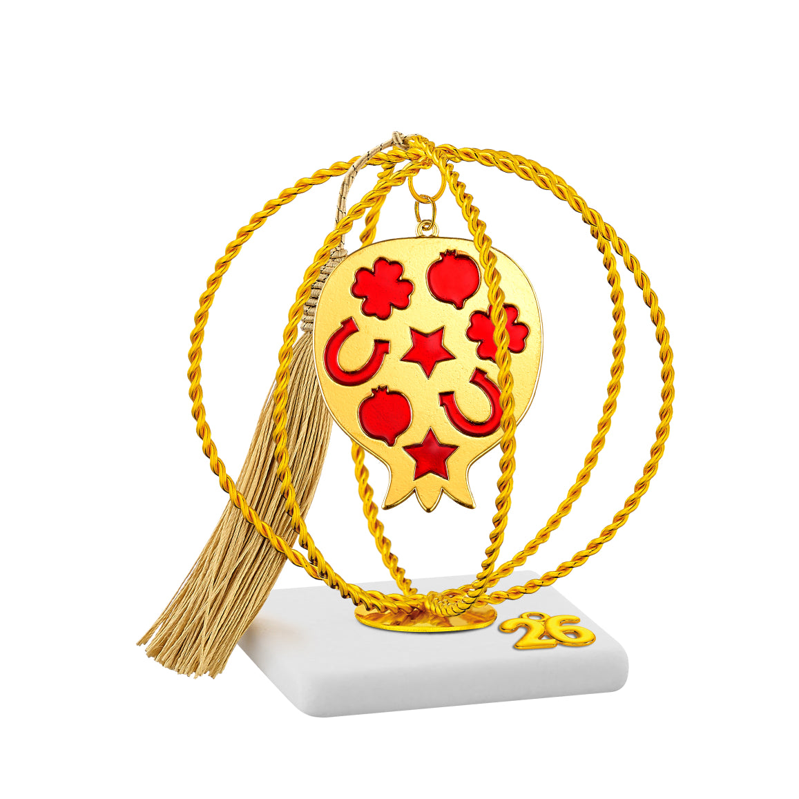 Γούρι 2026 Ρόδι με σχέδια σε Μαρμάρινη Βάση, Χρυσές Πλεξούδες και Φούντα Υ13εκ.