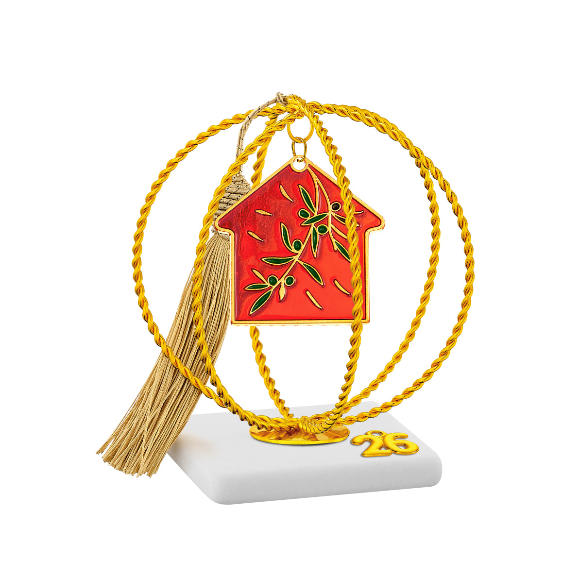 Γούρι 2026 Σπιτάκι με κλαδί ελιάς σε Μαρμάρινη Βάση, Χρυσές Πλεξούδες και Φούντα Υ13εκ.