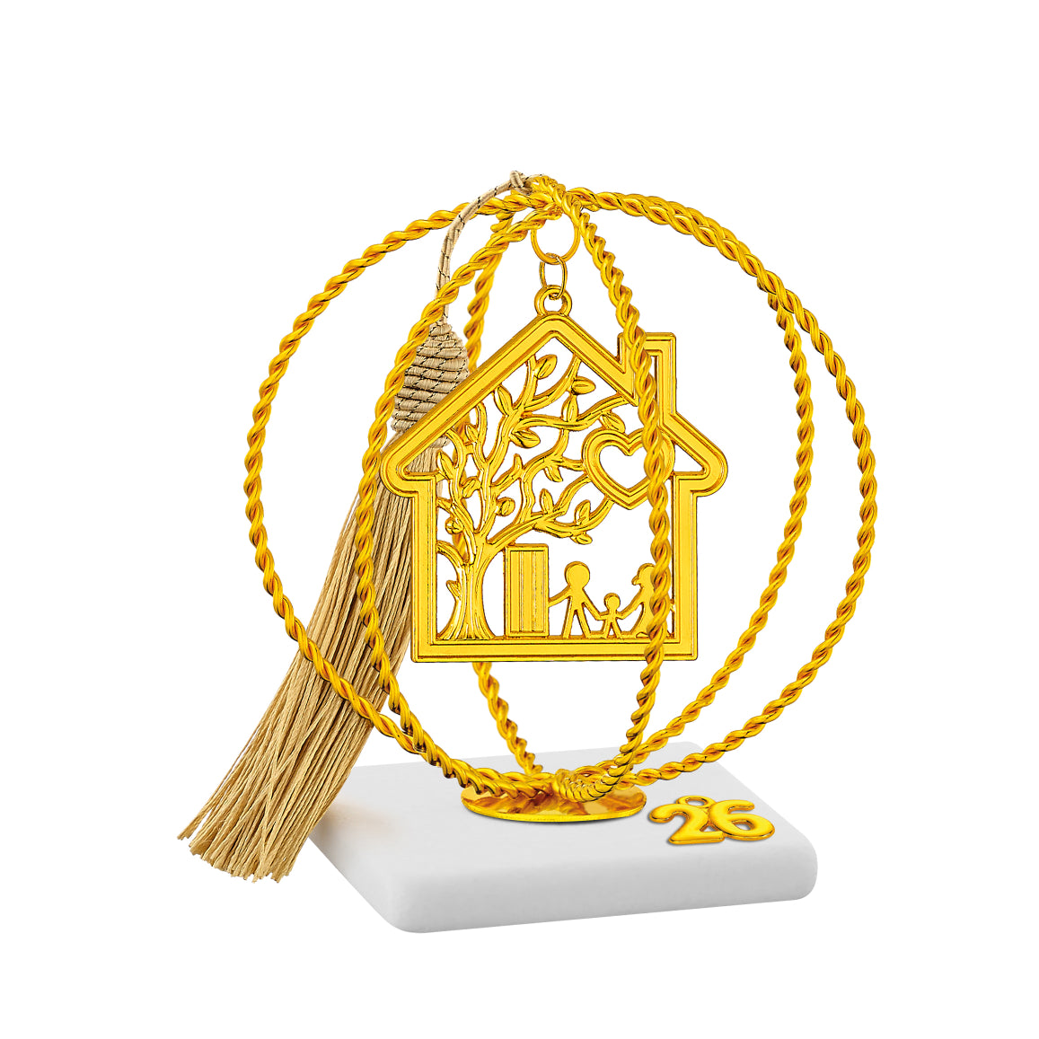 Γούρι 2026 Σπιτάκι χρυσό σε Μαρμάρινη Βάση, Χρυσές Πλεξούδες και Φούντα Υ13εκ.