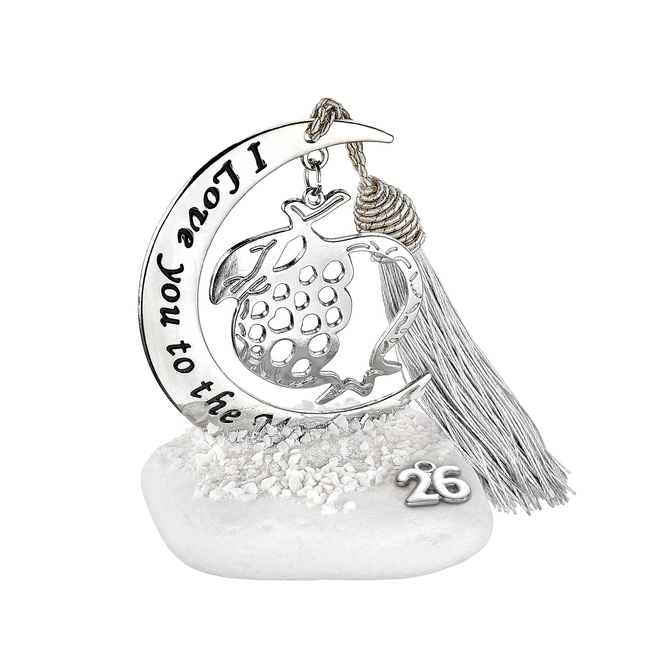 Χειροποίητο Επιτραπέζιο Γούρι 2026 σε βότσαλο με μεταλλικό ασημί Μισοφέγγαρο I love you to the moon 7X8εκ & μεταλλικό Ρόδι Διάτρητο ασημί χρώμα 4,5Χ5,5εκ και φούντα. Συνολικό ύψος περίπου Υ10εκ.