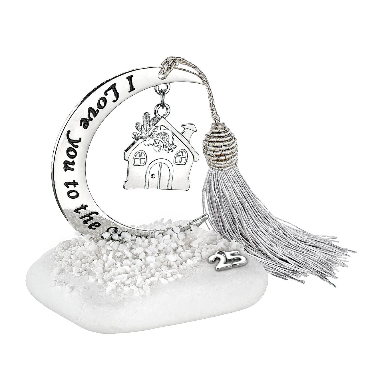 Χειροποίητο Επιτραπέζιο Γούρι 2026 σε βότσαλο με μεταλλικό ασημί Μισοφέγγαρο I love you to the moon 7X8εκ & μεταλλικό Σπιτάκι με Κλαδιά ασημί χρώμα 3Χ3,6εκ και φούντα. Συνολικό ύψος περίπου Υ10εκ.